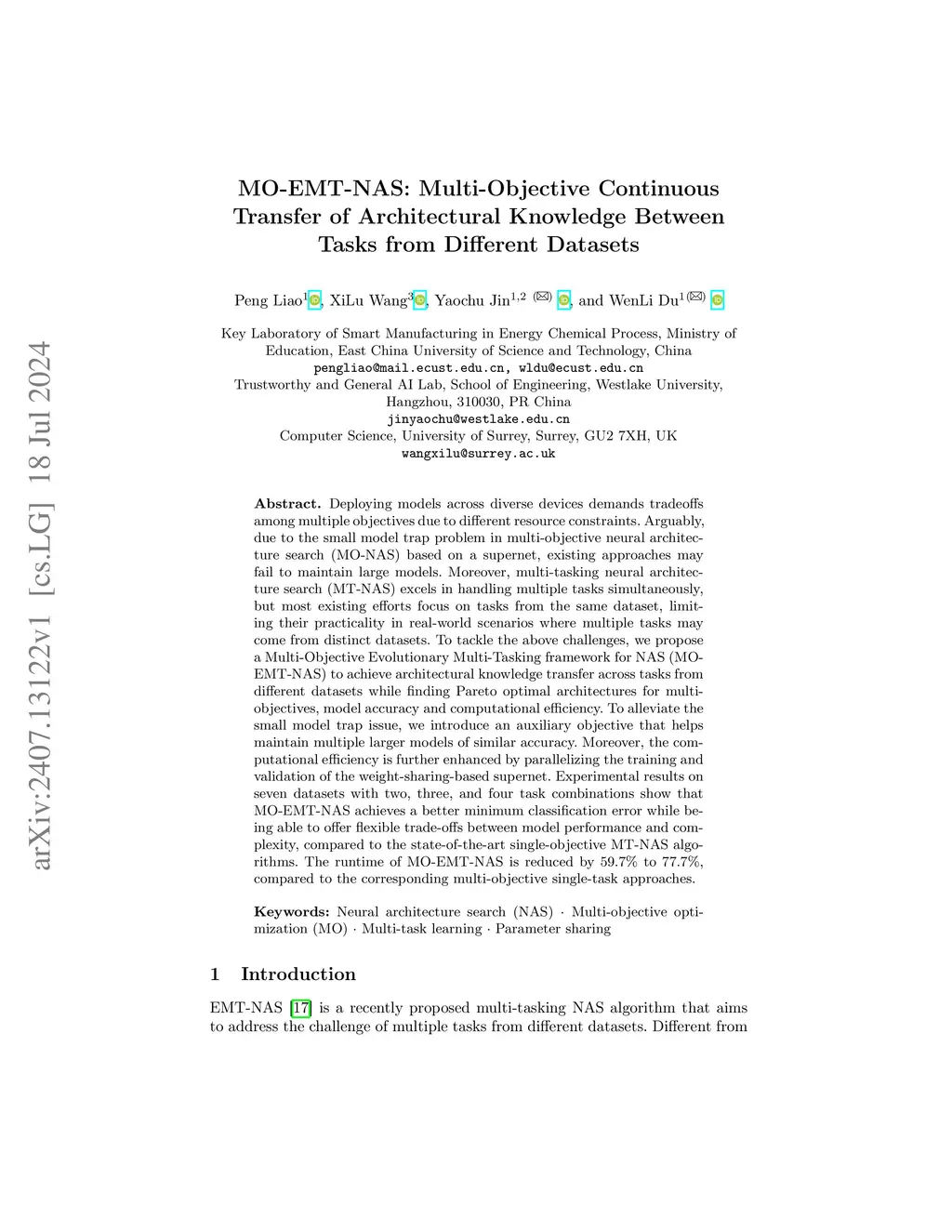 Deploying models across diverse devices demands tradeoffs among multiple objectives due to different resource constraints. Arguably, due to the small model trap problem in multi-objective neural architecture search (MO-NAS) based on a supernet, existing approaches may fail to maintain large models. Moreover, multi-tasking neural architecture search (MT-NAS) excels in handling multiple tasks simultaneously, but most existing efforts focus on tasks from the same dataset, limiting their practicality in real-world scenarios where multiple tasks may come from distinct datasets. To tackle the above challenges, we propose a Multi-Objective Evolutionary Multi-Tasking framework for NAS (MO-EMT-NAS) to achieve architectural knowledge transfer across tasks from different datasets while finding Pareto optimal architectures for multi-objectives, model accuracy and computational efficiency. To alleviate the small model trap issue, we introduce an auxiliary objective that helps maintain multiple larger models of similar accuracy. Moreover, the computational efficiency is further enhanced by parallelizing the training and validation of the weight-sharing-based supernet. Experimental results on seven datasets with two, three, and four task combinations show that MO-EMT-NAS achieves a better minimum classification error while being able to offer flexible trade-offs between model performance and complexity, compared to the state-of-the-art single-objective MT-NAS algorithms. The runtime of MO-EMT-NAS is reduced by 59.7% to 77.7%, compared to the corresponding multi-objective single-task approaches.