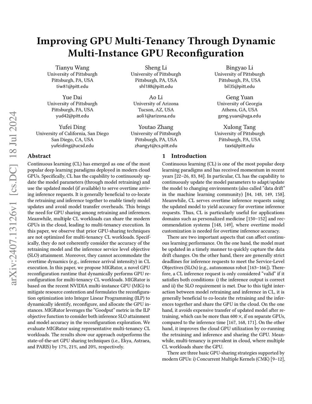 Continuous learning (CL) has emerged as one of the most popular deep learning paradigms deployed in modern cloud GPUs. Specifically, CL has the capability to continuously update the model parameters (through model retraining) and use the updated model (if available) to serve overtime arriving inference requests. It is generally beneficial to co-locate the retraining and inference together to enable timely model updates and avoid model transfer overheads. This brings the need for GPU sharing among retraining and inferences. Meanwhile, multiple CL workloads can share the modern GPUs in the cloud, leading to multi-tenancy execution. In this paper, we observe that prior GPU-sharing techniques are not optimized for multi-tenancy CL workloads. Specifically, they do not coherently consider the accuracy of the retraining model and the inference service level objective (SLO) attainment. Moreover, they cannot accommodate the overtime dynamics (e.g., inference arrival intensity) in CL execution. In this paper, we propose MIGRator, a novel GPU reconfiguration runtime that dynamically performs GPU reconfiguration for multi-tenancy CL workloads. MIGRator is based on the recent NVIDIA multi-instance GPU (MIG) to mitigate resource contention and formulates the reconfiguration optimization into Integer Linear Programming (ILP) to dynamically identify, reconfigure, and allocate the GPU instances. MIGRator leverages the "Goodput" metric in the ILP objective function to consider both inference SLO attainment and model accuracy in the reconfiguration exploration. We evaluate MIGRator using representative multi-tenancy CL workloads. The results show our approach outperforms the state-of-the-art GPU sharing techniques (i.e., Ekya, Astraea, and PARIS) by 17\%, 21\%, and 20\%, respectively.