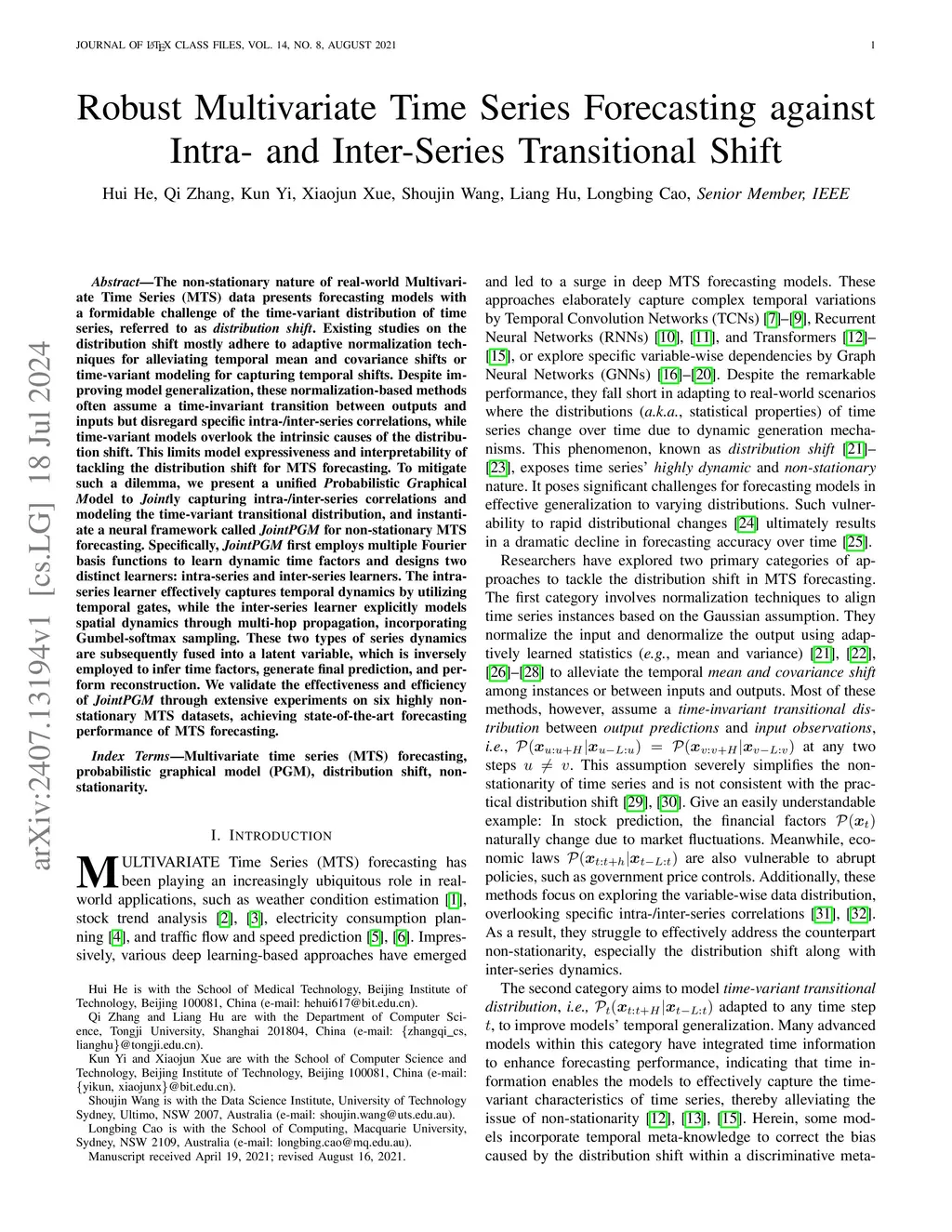The non-stationary nature of real-world Multivariate Time Series (MTS) data presents forecasting models with a formidable challenge of the time-variant distribution of time series, referred to as distribution shift. Existing studies on the distribution shift mostly adhere to adaptive normalization techniques for alleviating temporal mean and covariance shifts or time-variant modeling for capturing temporal shifts. Despite improving model generalization, these normalization-based methods often assume a time-invariant transition between outputs and inputs but disregard specific intra-/inter-series correlations, while time-variant models overlook the intrinsic causes of the distribution shift. This limits model expressiveness and interpretability of tackling the distribution shift for MTS forecasting. To mitigate such a dilemma, we present a unified Probabilistic Graphical Model to Jointly capturing intra-/inter-series correlations and modeling the time-variant transitional distribution, and instantiate a neural framework called JointPGM for non-stationary MTS forecasting. Specifically, JointPGM first employs multiple Fourier basis functions to learn dynamic time factors and designs two distinct learners: intra-series and inter-series learners. The intra-series learner effectively captures temporal dynamics by utilizing temporal gates, while the inter-series learner explicitly models spatial dynamics through multi-hop propagation, incorporating Gumbel-softmax sampling. These two types of series dynamics are subsequently fused into a latent variable, which is inversely employed to infer time factors, generate final prediction, and perform reconstruction. We validate the effectiveness and efficiency of JointPGM through extensive experiments on six highly non-stationary MTS datasets, achieving state-of-the-art forecasting performance of MTS forecasting.