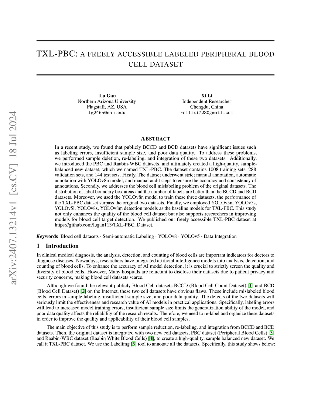 We present TXL-PBC, a curated and re-annotated peripheral blood cell dataset constructed by integrating four publicly available resources: Blood Cell Count and Detection (BCCD), Blood Cell Detection Dataset (BCDD), Peripheral Blood Cells (PBC), and Raabin White Blood Cell (Raabin-WBC). Through rigorous sample selection, semi-automatic annotation using the YOLOv8n model, and comprehensive manual review, we ensured high annotation accuracy and consistency. The final dataset contains 1,260 images and 18,143 bounding box annotations for three major blood cell types: white blood cells (WBC), red blood cells (RBC), and platelets. We provide detailed visual analyses of the data distribution, demonstrating the diversity and balance of the dataset. To further validate the quality and utility of TXL-PBC, we trained several mainstream object detection models, including YOLOv5s, YOLOv8s, YOLOv11s, SSD300, Faster R-CNN, and RetinaNet, and report their baseline performance. The TXL-PBC dataset is openly available on Figshare and GitHub, offering a valuable resource for the development and benchmarking of blood cell detection models and related machine learning research.