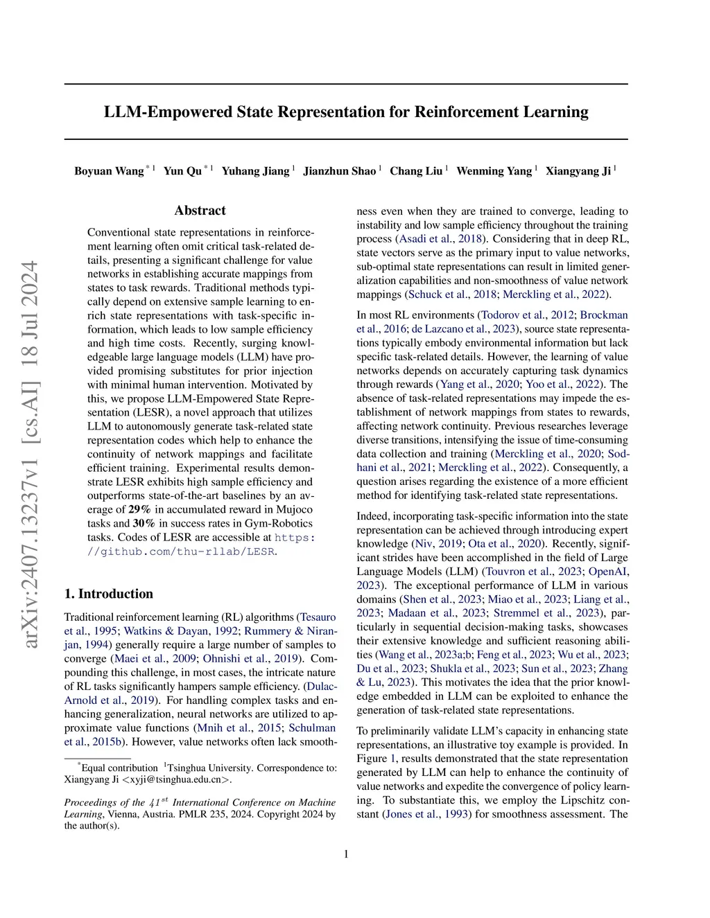 Conventional state representations in reinforcement learning often omit critical task-related details, presenting a significant challenge for value networks in establishing accurate mappings from states to task rewards. Traditional methods typically depend on extensive sample learning to enrich state representations with task-specific information, which leads to low sample efficiency and high time costs. Recently, surging knowledgeable large language models (LLM) have provided promising substitutes for prior injection with minimal human intervention. Motivated by this, we propose LLM-Empowered State Representation (LESR), a novel approach that utilizes LLM to autonomously generate task-related state representation codes which help to enhance the continuity of network mappings and facilitate efficient training. Experimental results demonstrate LESR exhibits high sample efficiency and outperforms state-of-the-art baselines by an average of 29% in accumulated reward in Mujoco tasks and 30% in success rates in Gym-Robotics tasks.