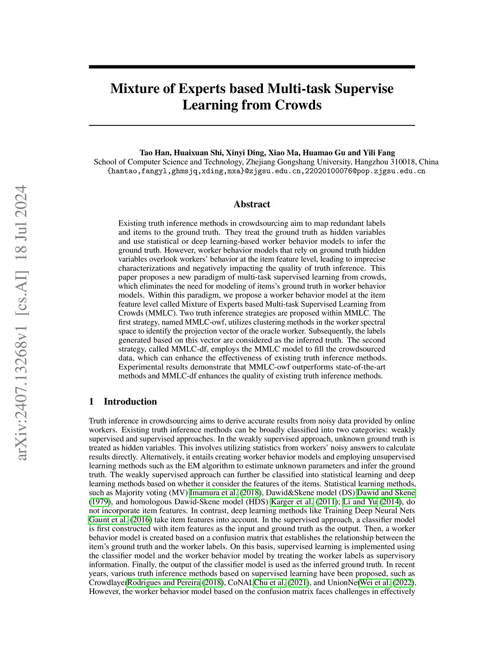 Existing truth inference methods in crowdsourcing aim to map redundant labels and items to the ground truth. They treat the ground truth as hidden variables and use statistical or deep learning-based worker behavior models to infer the ground truth. However, worker behavior models that rely on ground truth hidden variables overlook workers' behavior at the item feature level, leading to imprecise characterizations and negatively impacting the quality of truth inference. This paper proposes a new paradigm of multi-task supervised learning from crowds, which eliminates the need for modeling of items's ground truth in worker behavior models. Within this paradigm, we propose a worker behavior model at the item feature level called Mixture of Experts based Multi-task Supervised Learning from Crowds (MMLC). Two truth inference strategies are proposed within MMLC. The first strategy, named MMLC-owf, utilizes clustering methods in the worker spectral space to identify the projection vector of the oracle worker. Subsequently, the labels generated based on this vector are considered as the inferred truth. The second strategy, called MMLC-df, employs the MMLC model to fill the crowdsourced data, which can enhance the effectiveness of existing truth inference methods. Experimental results demonstrate that MMLC-owf outperforms state-of-the-art methods and MMLC-df enhances the quality of existing truth inference methods.