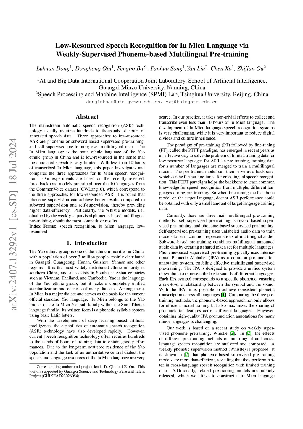 Low-Resourced Speech Recognition for Iu Mien Language via