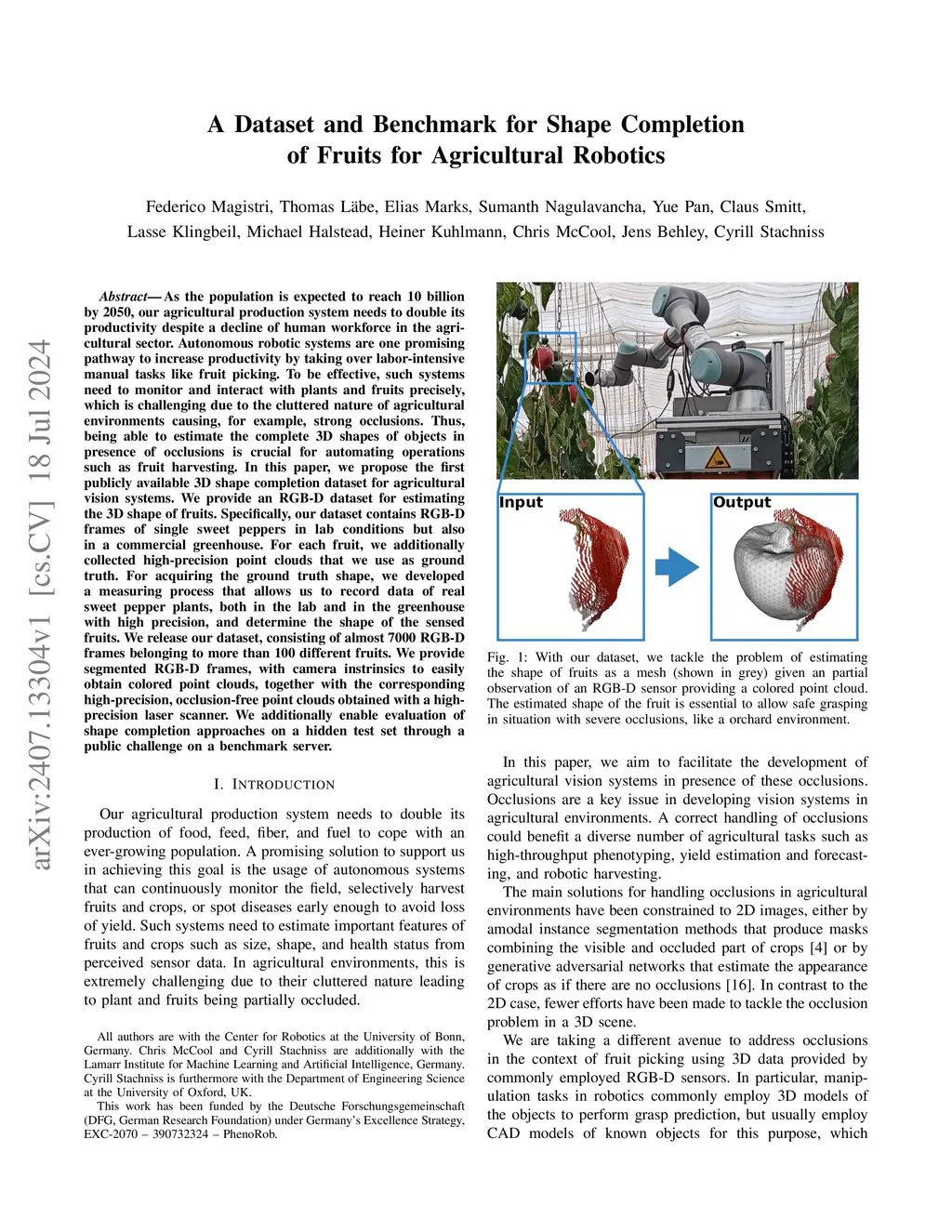 As the world population is expected to reach 10 billion by 2050, our agricultural production system needs to double its productivity despite a decline of human workforce in the agricultural sector. Autonomous robotic systems are one promising pathway to increase productivity by taking over labor-intensive manual tasks like fruit picking. To be effective, such systems need to monitor and interact with plants and fruits precisely, which is challenging due to the cluttered nature of agricultural environments causing, for example, strong occlusions. Thus, being able to estimate the complete 3D shapes of objects in presence of occlusions is crucial for automating operations such as fruit harvesting. In this paper, we propose the first publicly available 3D shape completion dataset for agricultural vision systems. We provide an RGB-D dataset for estimating the 3D shape of fruits. Specifically, our dataset contains RGB-D frames of single sweet peppers in lab conditions but also in a commercial greenhouse. For each fruit, we additionally collected high-precision point clouds that we use as ground truth. For acquiring the ground truth shape, we developed a measuring process that allows us to record data of real sweet pepper plants, both in the lab and in the greenhouse with high precision, and determine the shape of the sensed fruits. We release our dataset, consisting of almost 7,000 RGB-D frames belonging to more than 100 different fruits. We provide segmented RGB-D frames, with camera intrinsics to easily obtain colored point clouds, together with the corresponding high-precision, occlusion-free point clouds obtained with a high-precision laser scanner. We additionally enable evaluation of shape completion approaches on a hidden test set through a public challenge on a benchmark server.