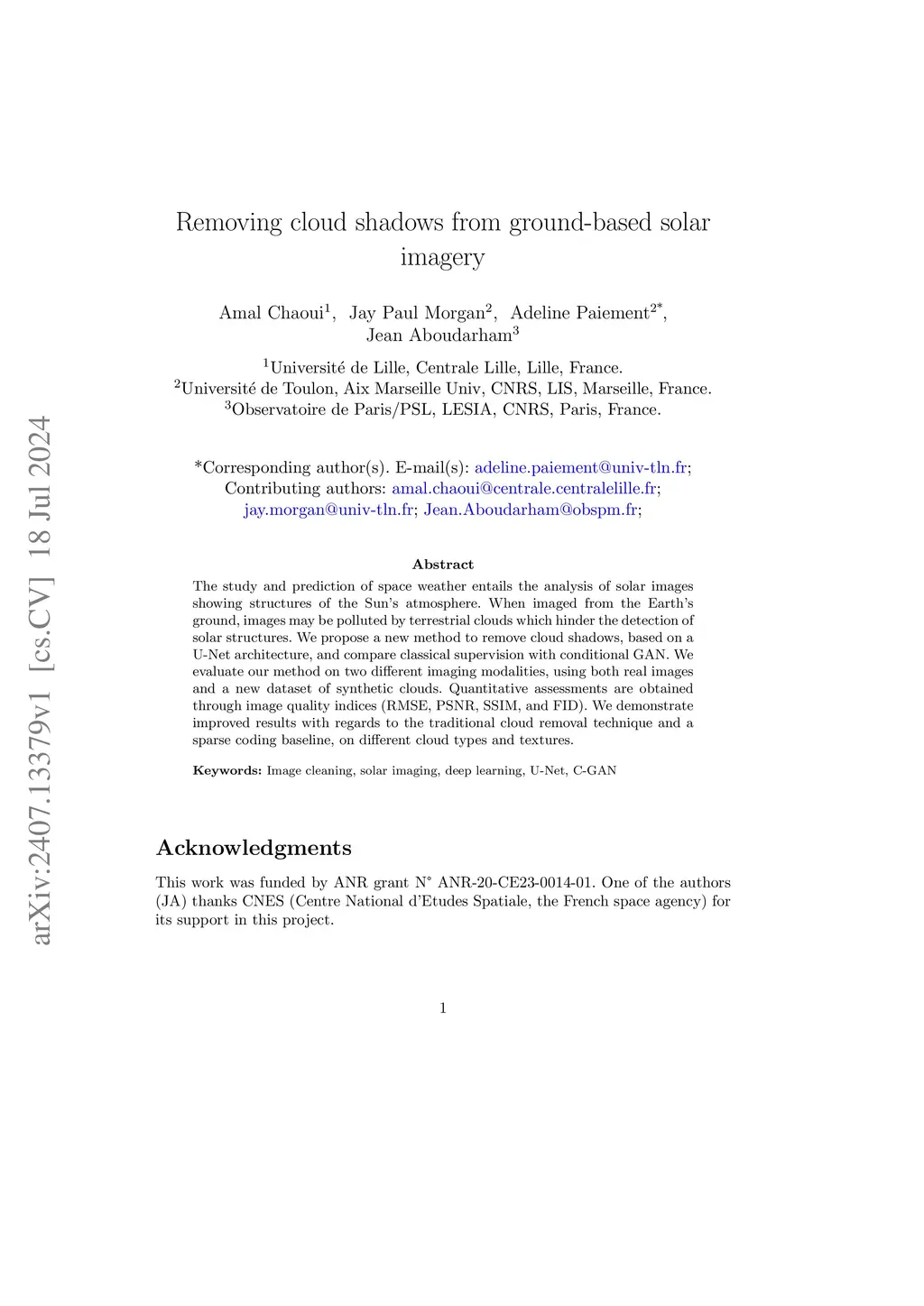 The study and prediction of space weather entails the analysis of solar images showing structures of the Sun's atmosphere. When imaged from the Earth's ground, images may be polluted by terrestrial clouds which hinder the detection of solar structures. We propose a new method to remove cloud shadows, based on a U-Net architecture, and compare classical supervision with conditional GAN. We evaluate our method on two different imaging modalities, using both real images and a new dataset of synthetic clouds. Quantitative assessments are obtained through image quality indices (RMSE, PSNR, SSIM, and FID). We demonstrate improved results with regards to the traditional cloud removal technique and a sparse coding baseline, on different cloud types and textures.