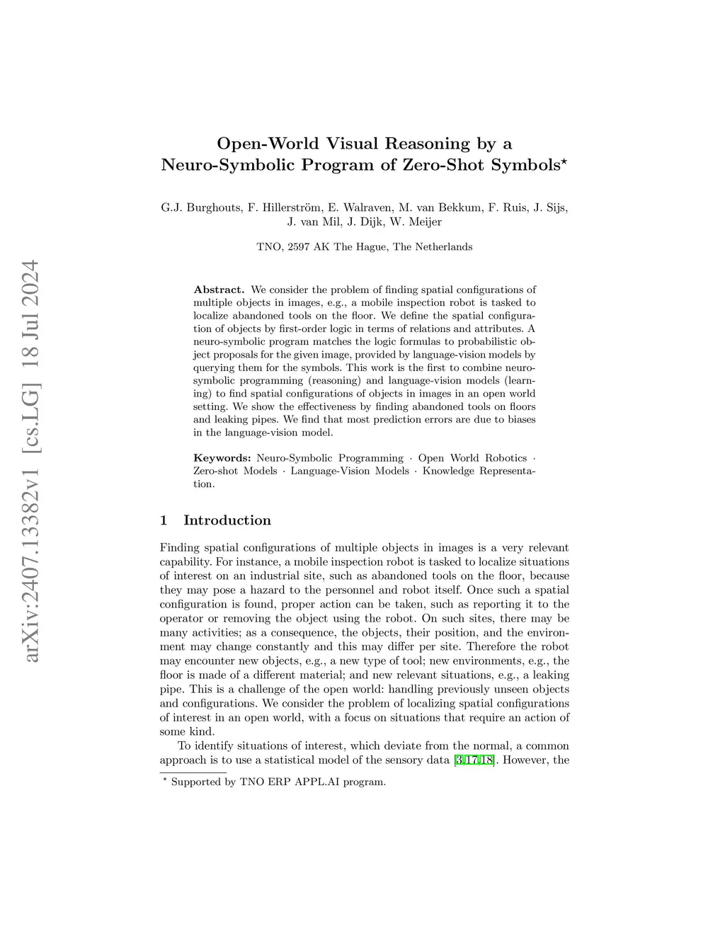 We consider the problem of finding spatial configurations of multiple objects in images, e.g., a mobile inspection robot is tasked to localize abandoned tools on the floor. We define the spatial configuration of objects by first-order logic in terms of relations and attributes. A neuro-symbolic program matches the logic formulas to probabilistic object proposals for the given image, provided by language-vision models by querying them for the symbols. This work is the first to combine neuro-symbolic programming (reasoning) and language-vision models (learning) to find spatial configurations of objects in images in an open world setting. We show the effectiveness by finding abandoned tools on floors and leaking pipes. We find that most prediction errors are due to biases in the language-vision model.