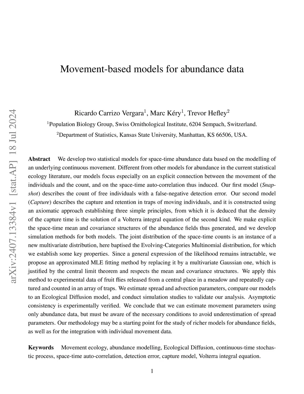 We develop two statistical models for space-time abundance data based on the modelling of an underlying continuous movement. Different from other models for abundance in the current statistical ecology literature, our models focus especially on an explicit connection between the movement of the individuals and the count, and on the space-time auto-correlation thus induced. Our first model (Snapshot) describes the count of free individuals with a false-negative detection error. Our second model (Capture) describes the capture and retention in traps of moving individuals, and it is constructed using an axiomatic approach establishing three simple principles, from which it is deduced that the density of the capture time is the solution of a Volterra integral equation of the second kind. We make explicit the space-time mean and covariance structures of the abundance fields thus generated, and we develop simulation methods for both models. The joint distribution of the space-time counts is an instance of a new multivariate distribution, here baptised the Evolving-Categories Multinomial distribution, for which we establish some key properties. Since a general expression of the likelihood remains intractable, we propose an approximated MLE fitting method by replacing it by a multivariate Gaussian one, which is justified by central limit theorem and respects mean and covariance structures. We apply this method to experimental data of fruit flies released in a meadow and repeatedly captured and counted in an array of traps. We estimate spread and advection parameters, compare our models to an Ecological Diffusion model, and conduct simulation studies to validate our analysis. Asymptotic consistency is experimentally verified. We conclude that we can estimate movement parameters using only abundance data, but must be aware of the necessary conditions to avoid underestimation of spread parameters.