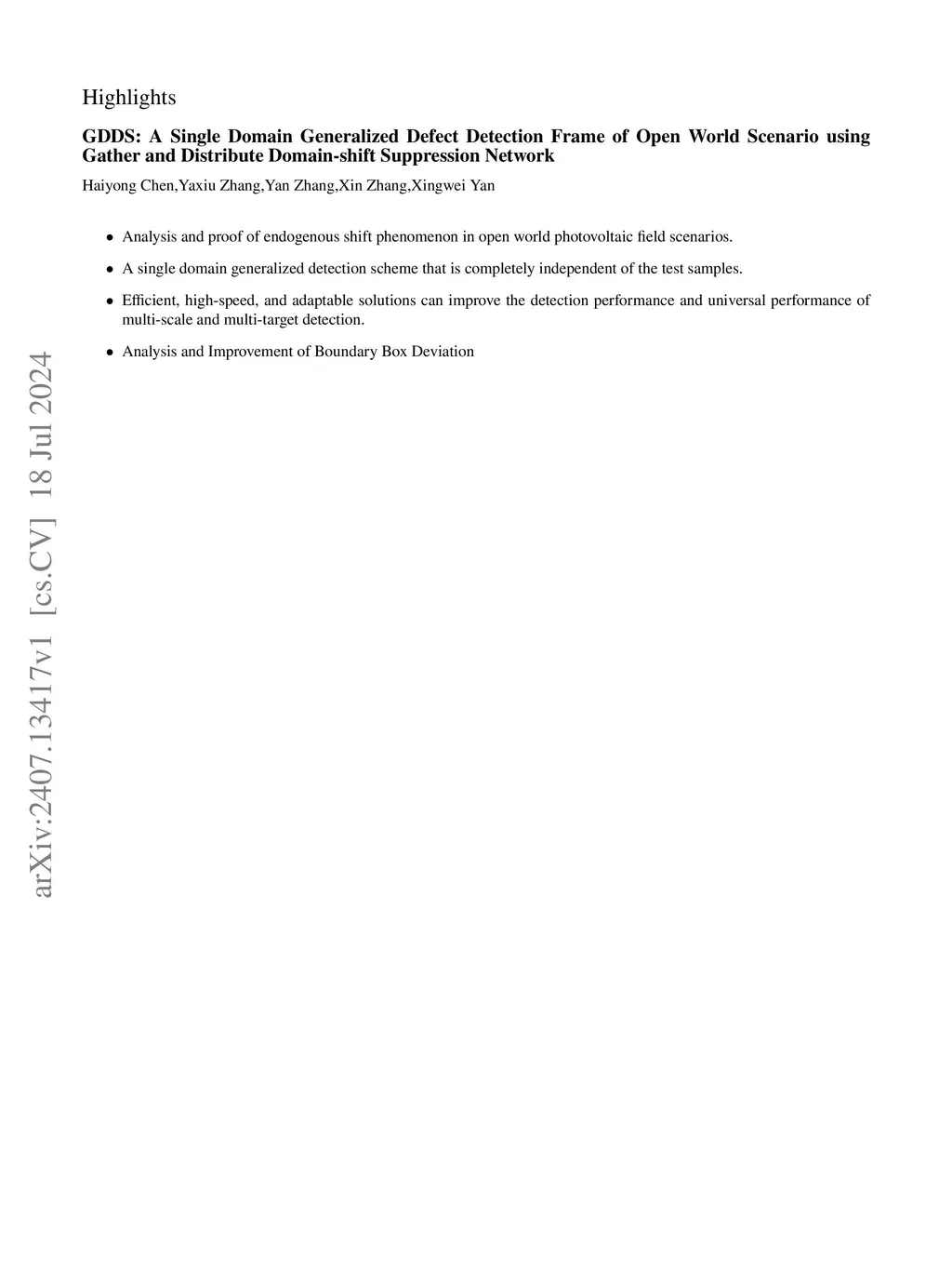Efficient and intelligent surface defect detection of photovoltaic modules is crucial for improving the quality of photovoltaic modules and ensuring the reliable operation of large-scale infrastructure. However, the scenario characteristics of data distribution deviation make the construction of defect detection models for open world scenarios such as photovoltaic manufacturing and power plant inspections a challenge. Therefore, we propose the Gather and Distribute Domain shift Suppression Network (GDDS). It adopts a single domain generalized method that is completely independent of the test samples to address the problem of distribution shift. Using a one-stage network as the baseline network breaks through the limitations of traditional domain generalization methods that typically use two-stage networks. It not only balances detection accuracy and speed but also simplifies the model deployment and application process. The GDDS includes two modules: DeepSpine Module and Gather and Distribute Module. Specifically, the DeepSpine Module applies a wider range of contextual information and suppresses background style shift by acquiring and concatenating multi-scale features. The Gather and Distribute Module collects and distributes global information to achieve cross layer interactive learning of multi-scale channel features and suppress defect instance shift. Furthermore, the GDDS utilizes normalized Wasserstein distance for similarity measurement, reducing measurement errors caused by bounding box position deviations. We conducted a comprehensive evaluation of GDDS on the EL endogenous shift dataset and Photovoltaic inspection infrared image dataset. The experimental results showed that GDDS can adapt to defect detection in open world scenarios faster and better than other state-of-the-art methods.