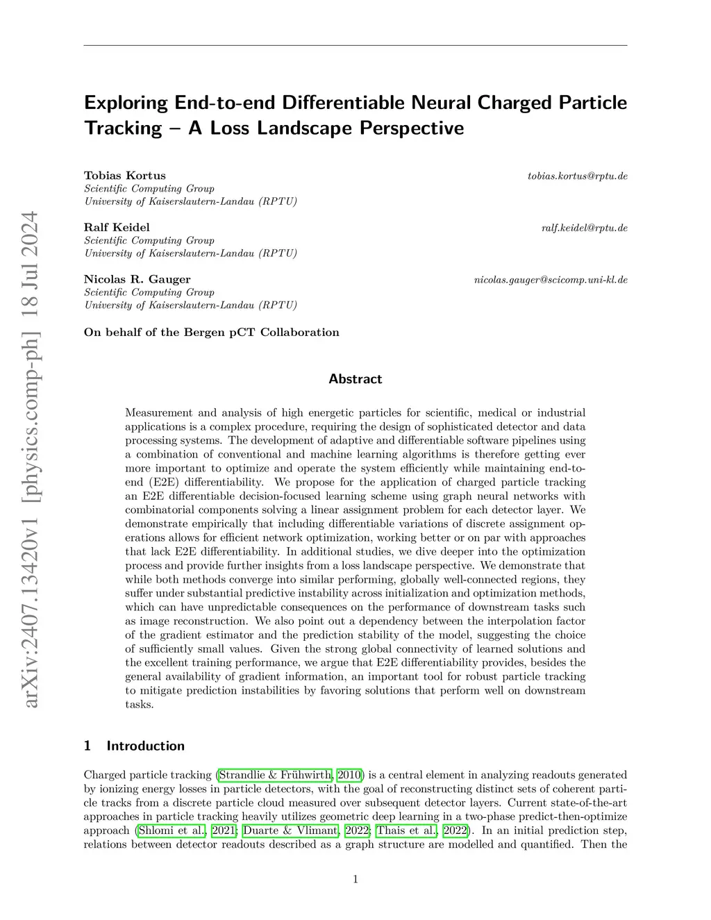 Measurement and analysis of high energetic particles for scientific, medical or industrial applications is a complex procedure, requiring the design of sophisticated detector and data processing systems. The development of adaptive and differentiable software pipelines using a combination of conventional and machine learning algorithms is therefore getting ever more important to optimize and operate the system efficiently while maintaining end-to-end (E2E) differentiability. We propose for the application of charged particle tracking an E2E differentiable decision-focused learning scheme using graph neural networks with combinatorial components solving a linear assignment problem for each detector layer. We demonstrate empirically that including differentiable variations of discrete assignment operations allows for efficient network optimization, working better or on par with approaches that lack E2E differentiability. In additional studies, we dive deeper into the optimization process and provide further insights from a loss landscape perspective. We demonstrate that while both methods converge into similar performing, globally well-connected regions, they suffer under substantial predictive instability across initialization and optimization methods, which can have unpredictable consequences on the performance of downstream tasks such as image reconstruction. We also point out a dependency between the interpolation factor of the gradient estimator and the prediction stability of the model, suggesting the choice of sufficiently small values. Given the strong global connectivity of learned solutions and the excellent training performance, we argue that E2E differentiability provides, besides the general availability of gradient information, an important tool for robust particle tracking to mitigate prediction instabilities by favoring solutions that perform well on downstream tasks.