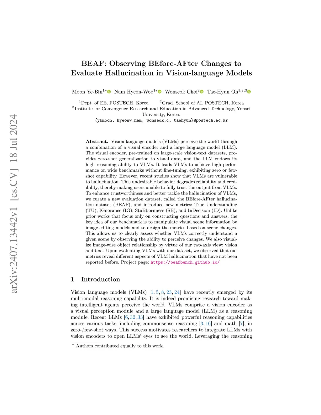 Vision language models (VLMs) perceive the world through a combination of a visual encoder and a large language model (LLM). The visual encoder, pre-trained on large-scale vision-text datasets, provides zero-shot generalization to visual data, and the LLM endows its high reasoning ability to VLMs. It leads VLMs to achieve high performance on wide benchmarks without fine-tuning, exhibiting zero or few-shot capability. However, recent studies show that VLMs are vulnerable to hallucination. This undesirable behavior degrades reliability and credibility, thereby making users unable to fully trust the output from VLMs. To enhance trustworthiness and better tackle the hallucination of VLMs, we curate a new evaluation dataset, called the BEfore-AFter hallucination dataset (BEAF), and introduce new metrics: True Understanding (TU), IGnorance (IG), StuBbornness (SB), and InDecision (ID). Unlike prior works that focus only on constructing questions and answers, the key idea of our benchmark is to manipulate visual scene information by image editing models and to design the metrics based on scene changes. This allows us to clearly assess whether VLMs correctly understand a given scene by observing the ability to perceive changes. We also visualize image-wise object relationship by virtue of our two-axis view: vision and text. Upon evaluating VLMs with our dataset, we observed that our metrics reveal different aspects of VLM hallucination that have not been reported before. Project page: \url{https://beafbench.github.io/}