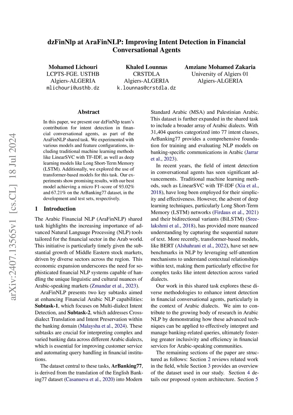 dzFinNlp at AraFinNLP: Improving Intent Detection in Financial