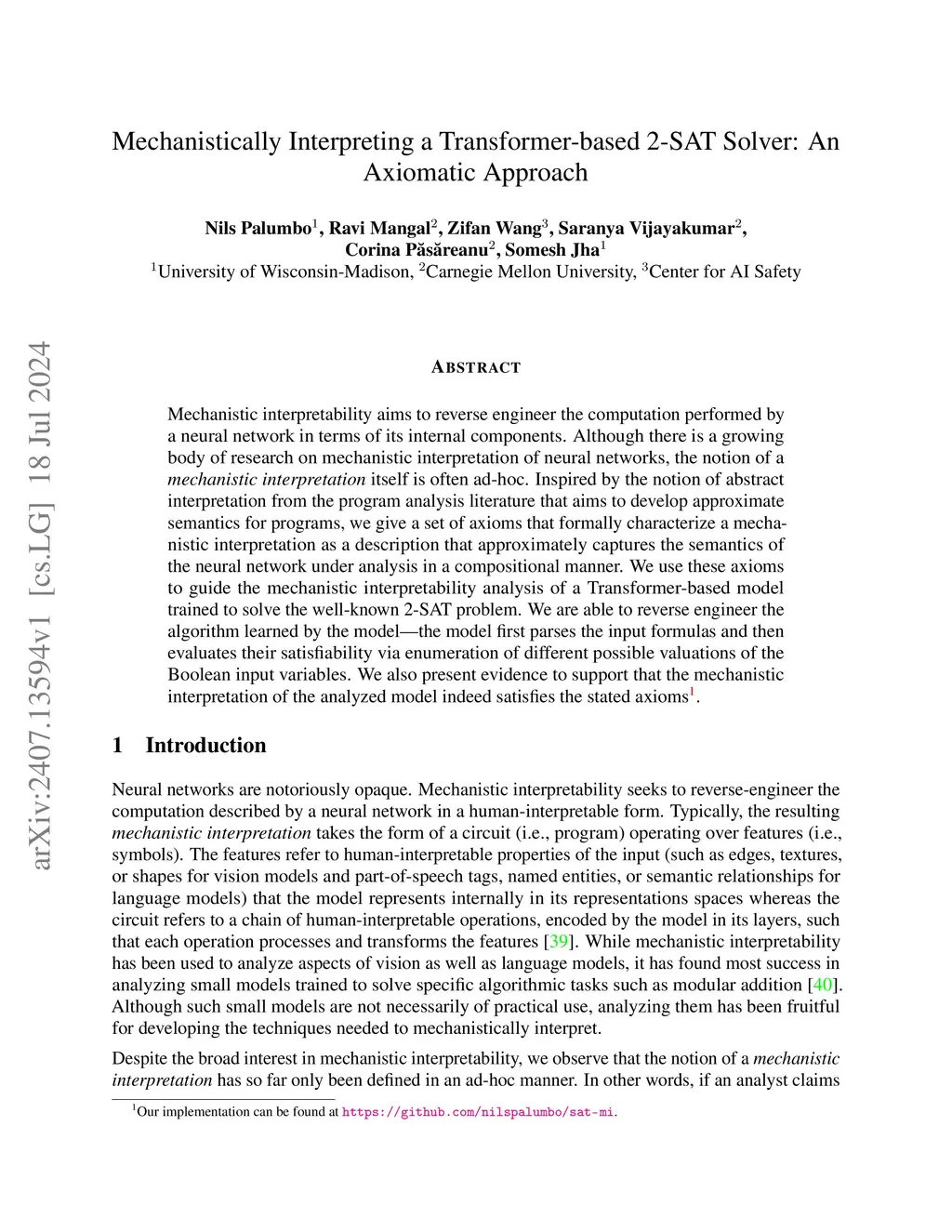 Mechanistic interpretability aims to reverse engineer the computation performed by a neural network in terms of its internal components. Although there is a growing body of research on mechanistic interpretation of neural networks, the notion of a mechanistic interpretation itself is often ad-hoc. Inspired by the notion of abstract interpretation from the program analysis literature that aims to develop approximate semantics for programs, we give a set of axioms that formally characterize a mechanistic interpretation as a description that approximately captures the semantics of the neural network under analysis in a compositional manner. We demonstrate the applicability of these axioms for validating mechanistic interpretations on an existing, well-known interpretability study as well as on a new case study involving a Transformer-based model trained to solve the well-known 2-SAT problem.