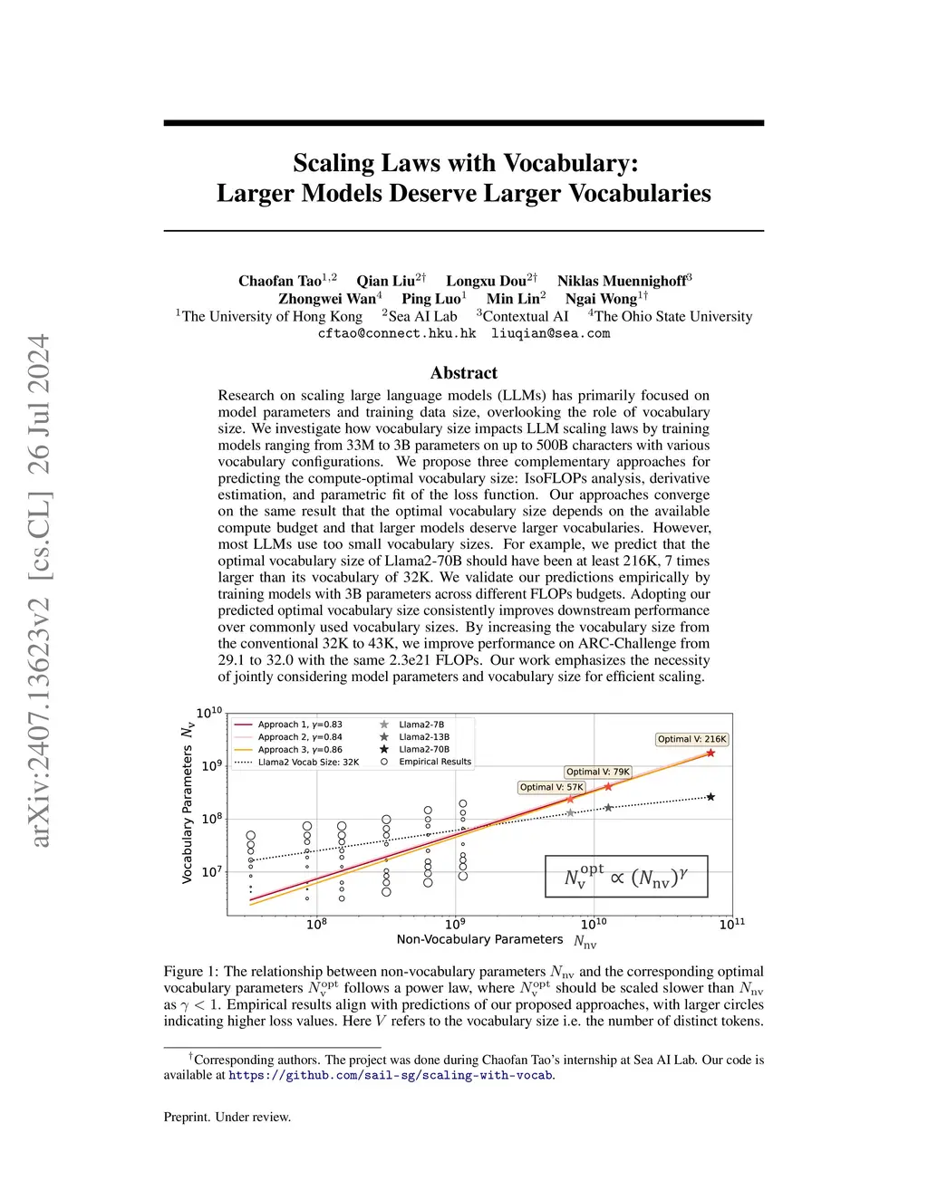 Research on scaling large language models (LLMs) has primarily focused on model parameters and training data size, overlooking the role of vocabulary size. We investigate how vocabulary size impacts LLM scaling laws by training models ranging from 33M to 3B parameters on up to 500B characters with various vocabulary configurations. We propose three complementary approaches for predicting the compute-optimal vocabulary size: IsoFLOPs analysis, derivative estimation, and parametric fit of the loss function. Our approaches converge on the same result that the optimal vocabulary size depends on the available compute budget and that larger models deserve larger vocabularies. However, most LLMs use too small vocabulary sizes. For example, we predict that the optimal vocabulary size of Llama2-70B should have been at least 216K, 7 times larger than its vocabulary of 32K. We validate our predictions empirically by training models with 3B parameters across different FLOPs budgets. Adopting our predicted optimal vocabulary size consistently improves downstream performance over commonly used vocabulary sizes. By increasing the vocabulary size from the conventional 32K to 43K, we improve performance on ARC-Challenge from 29.1 to 32.0 with the same 2.3e21 FLOPs. Our work emphasizes the necessity of jointly considering model parameters and vocabulary size for efficient scaling.