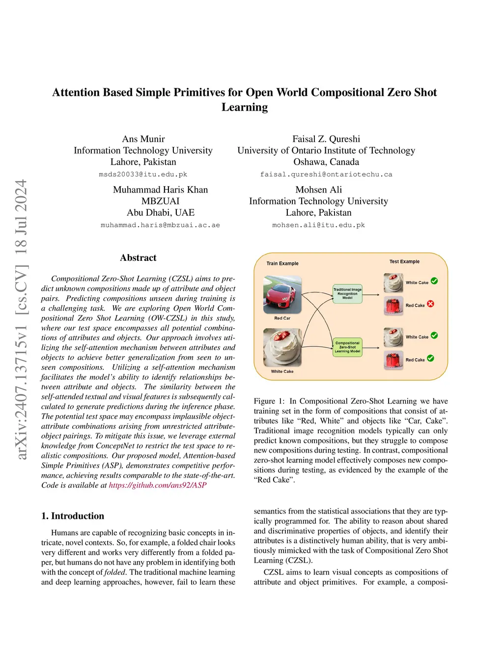 Compositional Zero-Shot Learning (CZSL) aims to predict unknown compositions made up of attribute and object pairs. Predicting compositions unseen during training is a challenging task. We are exploring Open World Compositional Zero-Shot Learning (OW-CZSL) in this study, where our test space encompasses all potential combinations of attributes and objects. Our approach involves utilizing the self-attention mechanism between attributes and objects to achieve better generalization from seen to unseen compositions. Utilizing a self-attention mechanism facilitates the model's ability to identify relationships between attribute and objects. The similarity between the self-attended textual and visual features is subsequently calculated to generate predictions during the inference phase. The potential test space may encompass implausible object-attribute combinations arising from unrestricted attribute-object pairings. To mitigate this issue, we leverage external knowledge from ConceptNet to restrict the test space to realistic compositions. Our proposed model, Attention-based Simple Primitives (ASP), demonstrates competitive performance, achieving results comparable to the state-of-the-art.