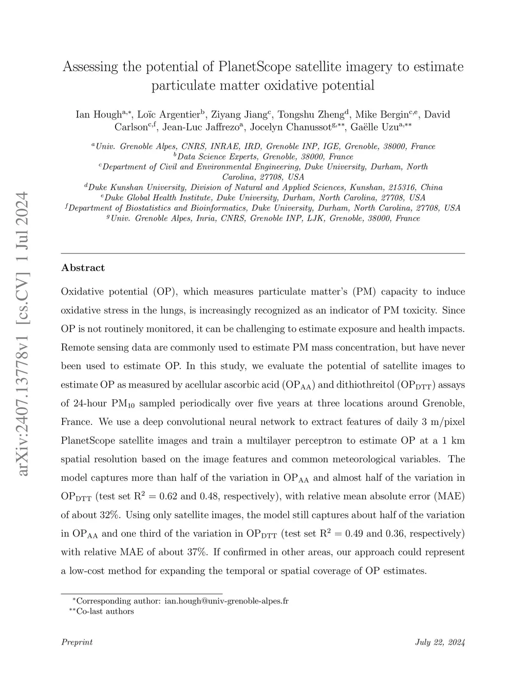 Oxidative potential (OP), which measures particulate matter's (PM) capacity to induce oxidative stress in the lungs, is increasingly recognized as an indicator of PM toxicity. Since OP is not routinely monitored, it can be challenging to estimate exposure and health impacts. Remote sensing data are commonly used to estimate PM mass concentration, but have never been used to estimate OP. In this study, we evaluate the potential of satellite images to estimate OP as measured by acellular ascorbic acid (OP AA) and dithiothreitol (OP DTT) assays of 24-hour PM10 sampled periodically over five years at three locations around Grenoble, France. We use a deep convolutional neural network to extract features of daily 3 m/pixel PlanetScope satellite images and train a multilayer perceptron to estimate OP at a 1 km spatial resolution based on the image features and common meteorological variables. The model captures more than half of the variation in OP AA and almost half of the variation in OP DTT (test set R2 = 0.62 and 0.48, respectively), with relative mean absolute error (MAE) of about 32%. Using only satellite images, the model still captures about half of the variation in OP AA and one third of the variation in OP DTT (test set R2 = 0.49 and 0.36, respectively) with relative MAE of about 37%. If confirmed in other areas, our approach could represent a low-cost method for expanding the temporal or spatial coverage of OP estimates.