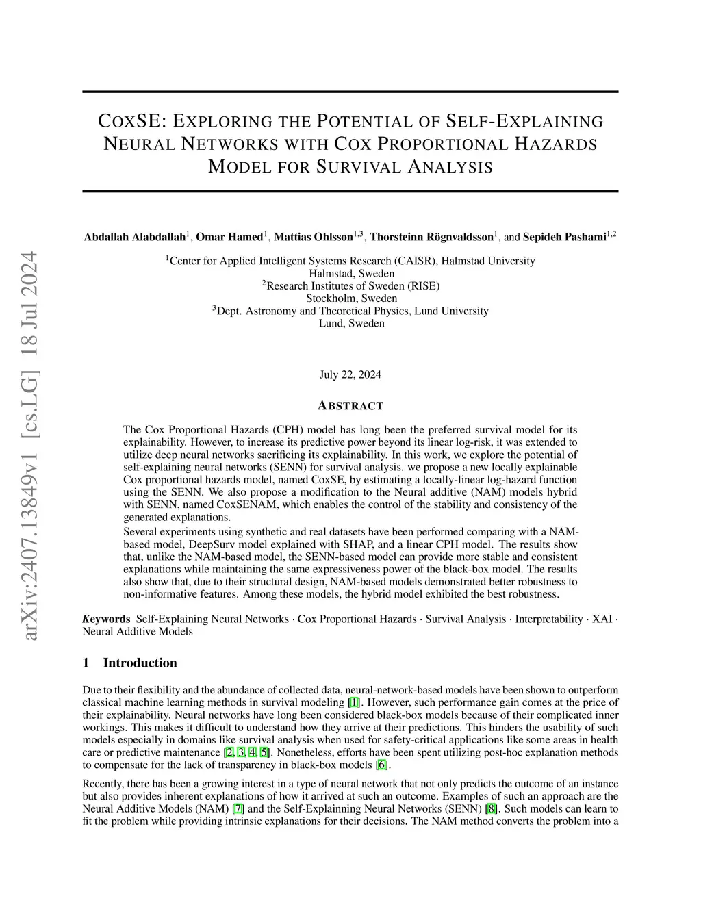 The Cox Proportional Hazards (CPH) model has long been the preferred survival model for its explainability. However, to increase its predictive power beyond its linear log-risk, it was extended to utilize deep neural networks, sacrificing its explainability. In this work, we explore the potential of self-explaining neural networks (SENN) for survival analysis. We propose a new locally explainable Cox proportional hazards model, named CoxSE, by estimating a locally-linear log-hazard function using the SENN. We also propose a modification to the Neural additive (NAM) model, hybrid with SENN, named CoxSENAM, which enables the control of the stability and consistency of the generated explanations.Several experiments using synthetic and real datasets are presented, benchmarking CoxSE and CoxSENAM against a NAM-based model, a DeepSurv model explained with SHAP, and a linear CPH model. The results show that, unlike the NAM-based model, the SENN-based model can provide more stable and consistent explanations while maintaining the predictive power of the black-box model. The results also show that, due to their structural design, NAM-based models demonstrate better robustness to non-informative features. Among the models, the hybrid model exhibits the best robustness.