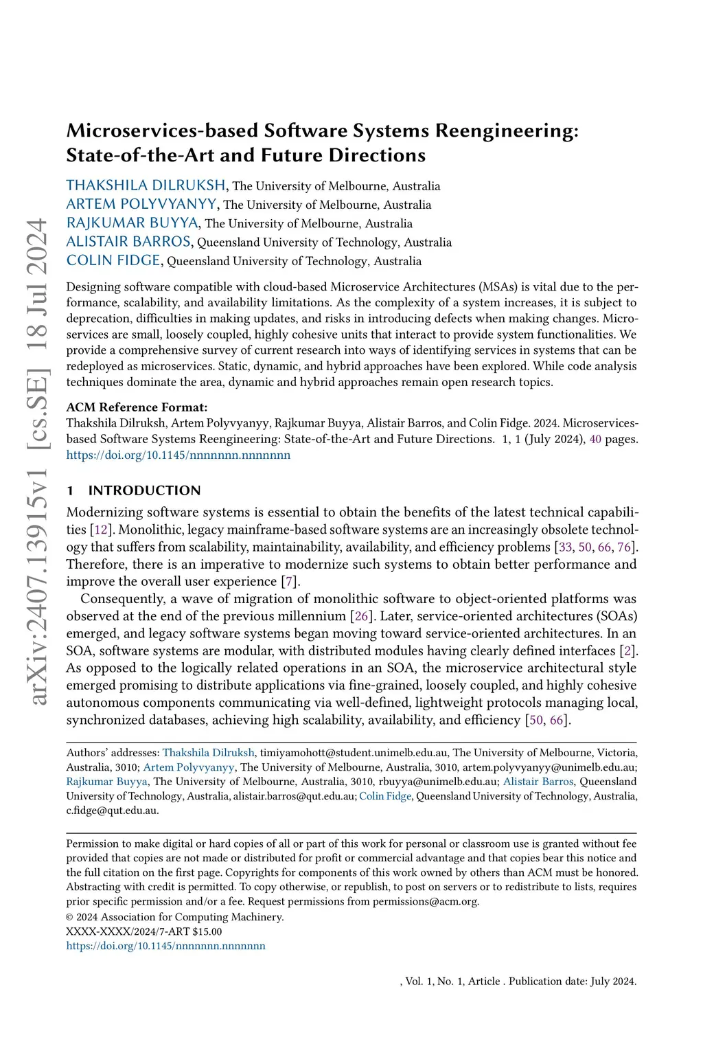 Designing software compatible with cloud-based Microservice Architectures (MSAs) is vital due to the performance, scalability, and availability limitations. As the complexity of a system increases, it is subject to deprecation, difficulties in making updates, and risks in introducing defects when making changes. Microservices are small, loosely coupled, highly cohesive units that interact to provide system functionalities. We provide a comprehensive survey of current research into ways of identifying services in systems that can be redeployed as microservices. Static, dynamic, and hybrid approaches have been explored. While code analysis techniques dominate the area, dynamic and hybrid approaches remain open research topics.