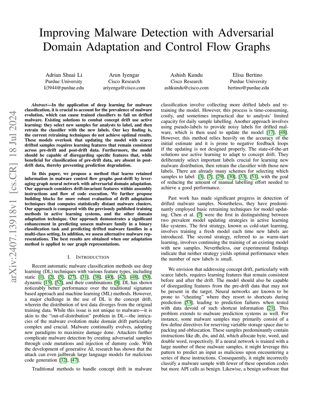 In the application of deep learning for malware classification, it is crucial to account for the prevalence of malware evolution, which can cause trained classifiers to fail on drifted malware. Existing solutions to combat concept drift use active learning: they select new samples for analysts to label, and then retrain the classifier with the new labels. Our key finding is, the current retraining techniques do not achieve optimal results. These models overlook that updating the model with scarce drifted samples requires learning features that remain consistent across pre-drift and post-drift data. Furthermore, the model should be capable of disregarding specific features that, while beneficial for classification of pre-drift data, are absent in post-drift data, thereby preventing prediction degradation. In this paper, we propose a method that learns retained information in malware control flow graphs post-drift by leveraging graph neural network with adversarial domain adaptation. Our approach considers drift-invariant features within assembly instructions and flow of code execution. We further propose building blocks for more robust evaluation of drift adaptation techniques that computes statistically distant malware clusters. Our approach is compared with the previously published training methods in active learning systems, and the other domain adaptation technique. Our approach demonstrates a significant enhancement in predicting unseen malware family in a binary classification task and predicting drifted malware families in a multi-class setting. In addition, we assess alternative malware representations. The best results are obtained when our adaptation method is applied to our graph representations.
