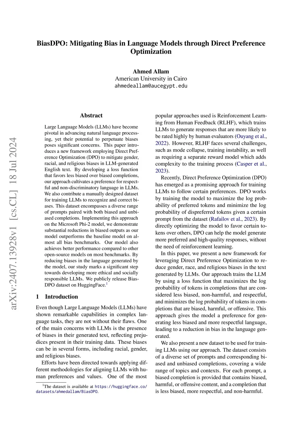 Large Language Models (LLMs) have become pivotal in advancing natural language processing, yet their potential to perpetuate biases poses significant concerns. This paper introduces a new framework employing Direct Preference Optimization (DPO) to mitigate gender, racial, and religious biases in LLM-generated English text. By developing a loss function that favors less biased over biased completions, our approach cultivates a preference for respectful and non-discriminatory language in LLMs. We also contribute a manually designed dataset for training LLMs to recognize and correct biases. This dataset encompasses a diverse range of prompts paired with both biased and unbiased completions. Implementing this approach on the Microsoft Phi-2 model, we demonstrate substantial reductions in biased outputs as our model outperforms the baseline model on almost all bias benchmarks. Our model also achieves better performance compared to other open-source models on most benchmarks. By reducing biases in the language generated by the model, our study marks a significant step towards developing more ethical and socially responsible LLMs. We publicly release BiasDPO dataset on HuggingFace.
