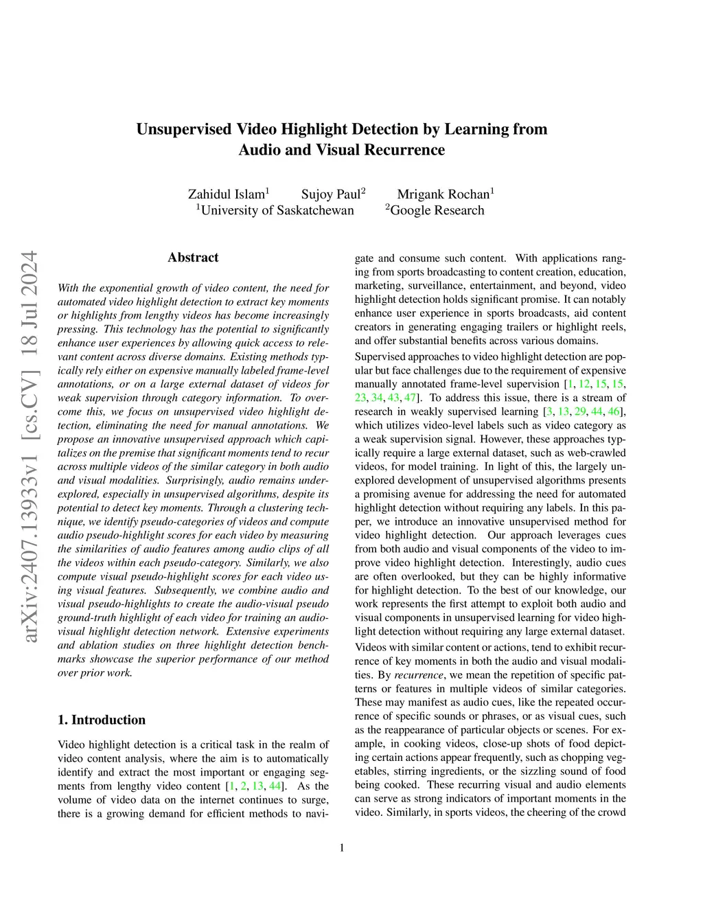 Unsupervised Video Highlight Detection by Learning from Audio and Visual Recurrence