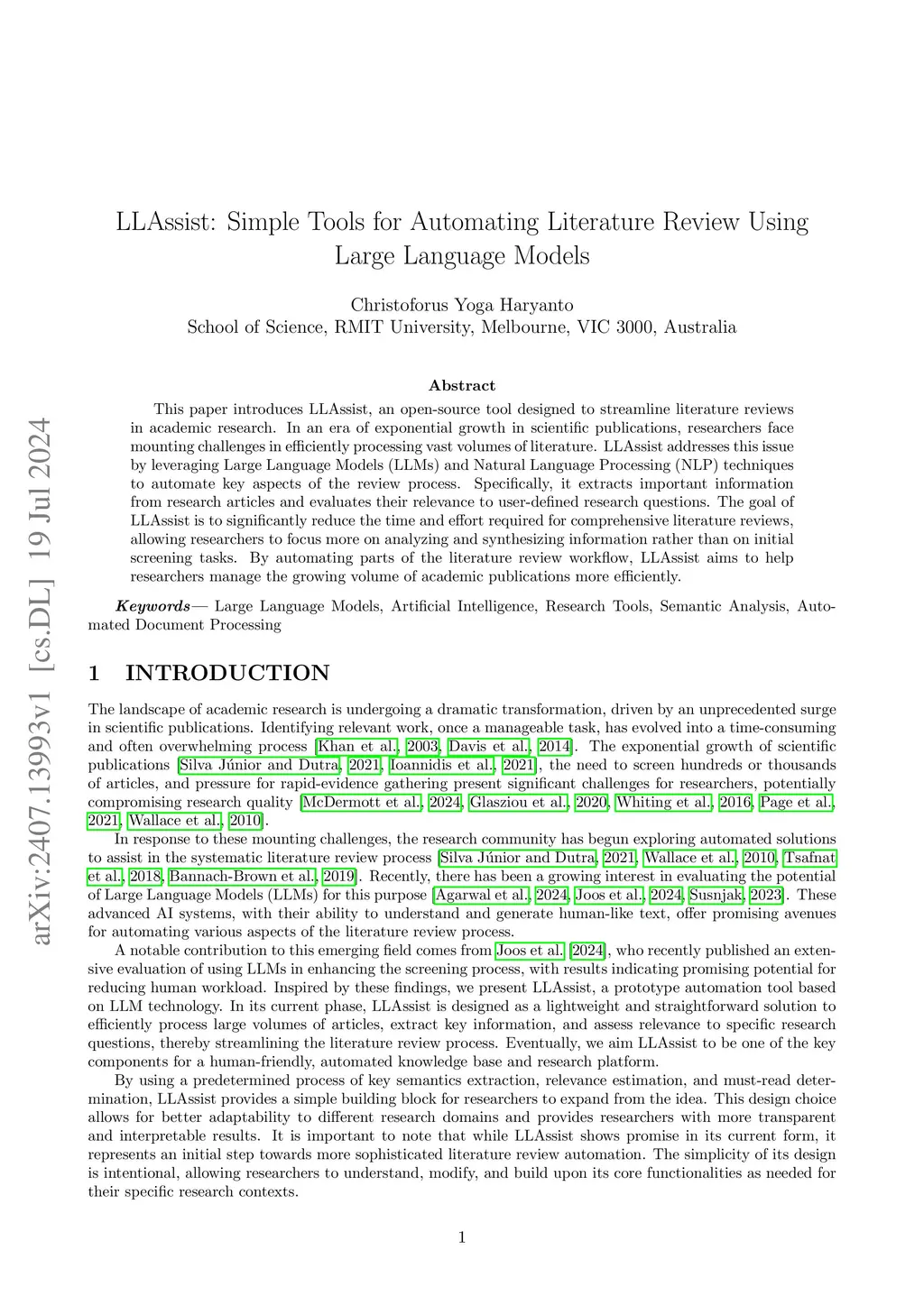 This paper introduces LLAssist, an open-source tool designed to streamline literature reviews in academic research. In an era of exponential growth in scientific publications, researchers face mounting challenges in efficiently processing vast volumes of literature. LLAssist addresses this issue by leveraging Large Language Models (LLMs) and Natural Language Processing (NLP) techniques to automate key aspects of the review process. Specifically, it extracts important information from research articles and evaluates their relevance to user-defined research questions. The goal of LLAssist is to significantly reduce the time and effort required for comprehensive literature reviews, allowing researchers to focus more on analyzing and synthesizing information rather than on initial screening tasks. By automating parts of the literature review workflow, LLAssist aims to help researchers manage the growing volume of academic publications more efficiently.