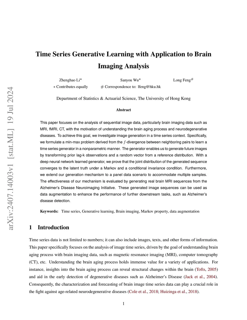 This paper focuses on the analysis of sequential image data, particularly brain imaging data such as MRI, fMRI, CT, with the motivation of understanding the brain aging process and neurodegenerative diseases. To achieve this goal, we investigate image generation in a time series context. Specifically, we formulate a min-max problem derived from the -divergence between neighboring pairs to learn a time series generator in a nonparametric manner. The generator enables us to generate future images by transforming prior lag-k observations and a random vector from a reference distribution. With a deep neural network learned generator, we prove that the joint distribution of the generated sequence converges to the latent truth under a Markov and a conditional invariance condition. Furthermore, we extend our generation mechanism to a panel data scenario to accommodate multiple samples. The effectiveness of our mechanism is evaluated by generating real brain MRI sequences from the Alzheimer's Disease Neuroimaging Initiative. These generated image sequences can be used as data augmentation to enhance the performance of further downstream tasks, such as Alzheimer's disease detection.