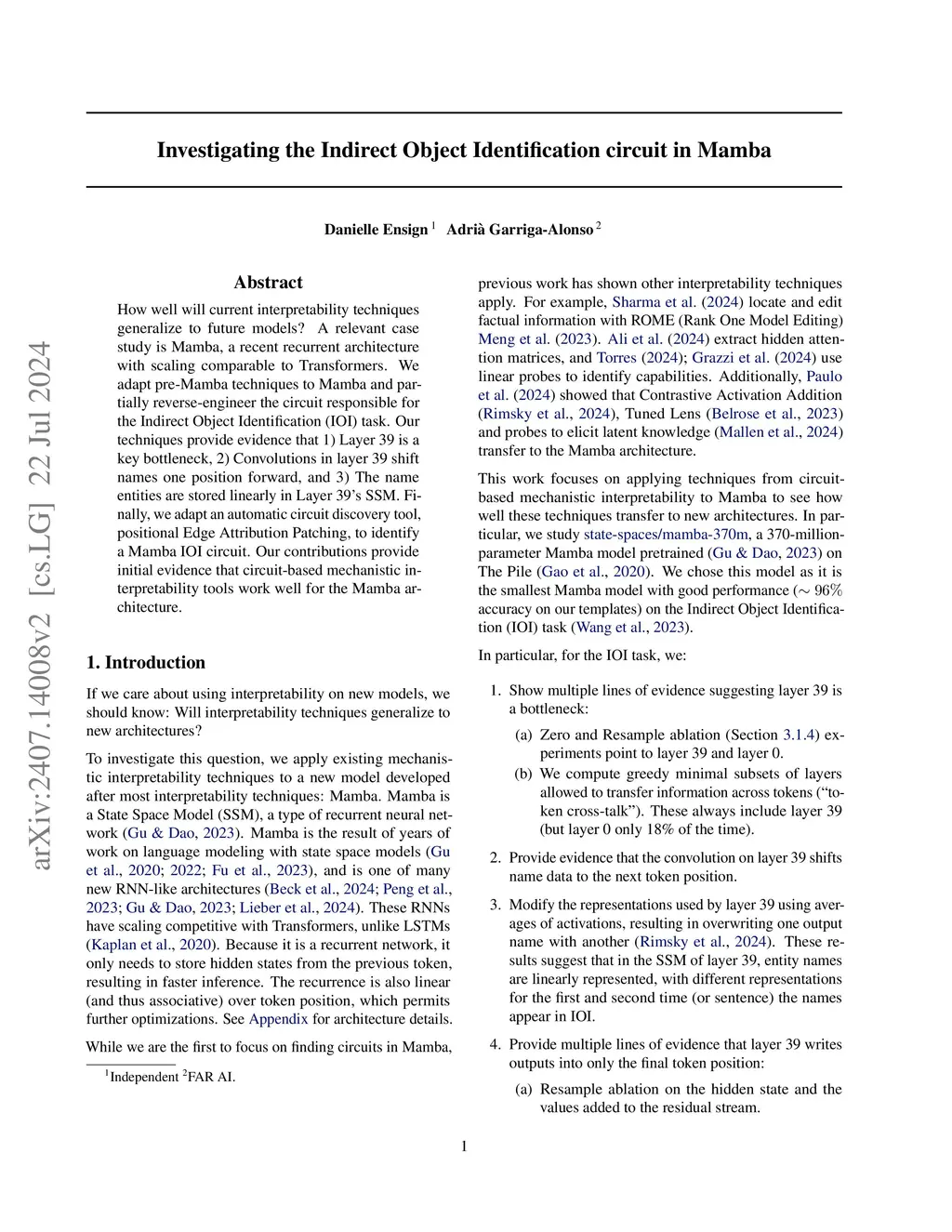 How well will current interpretability techniques generalize to future models? A relevant case study is Mamba, a recent recurrent architecture with scaling comparable to Transformers. We adapt pre-Mamba techniques to Mamba and partially reverse-engineer the circuit responsible for the Indirect Object Identification (IOI) task. Our techniques provide evidence that 1) Layer 39 is a key bottleneck, 2) Convolutions in layer 39 shift names one position forward, and 3) The name entities are stored linearly in Layer 39's SSM. Finally, we adapt an automatic circuit discovery tool, positional Edge Attribution Patching, to identify a Mamba IOI circuit. Our contributions provide initial evidence that circuit-based mechanistic interpretability tools work well for the Mamba architecture.