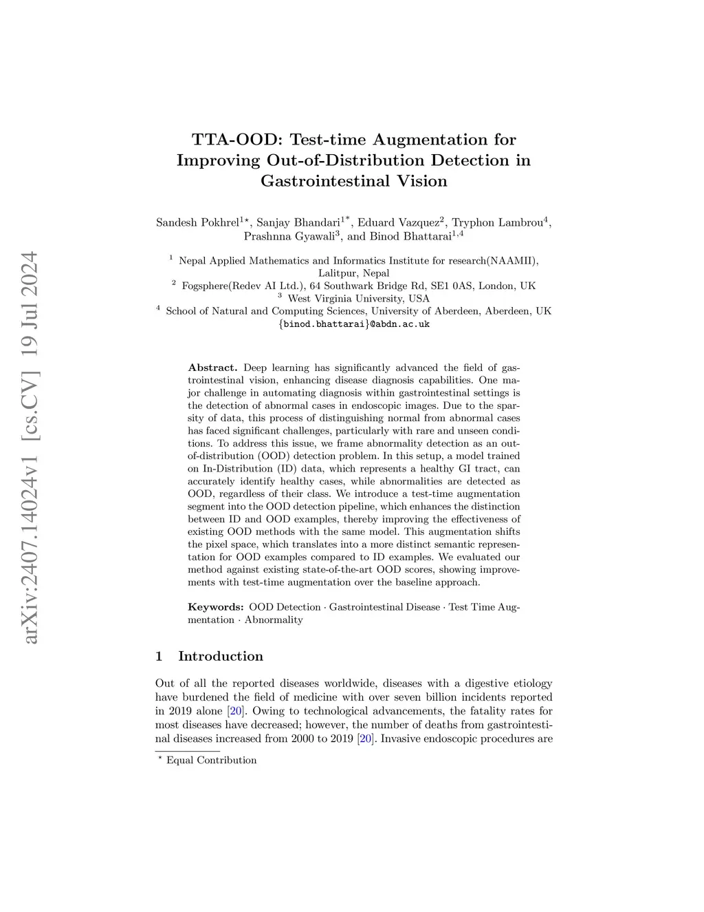Deep learning has significantly advanced the field of gastrointestinal vision, enhancing disease diagnosis capabilities. One major challenge in automating diagnosis within gastrointestinal settings is the detection of abnormal cases in endoscopic images. Due to the sparsity of data, this process of distinguishing normal from abnormal cases has faced significant challenges, particularly with rare and unseen conditions. To address this issue, we frame abnormality detection as an out-of-distribution (OOD) detection problem. In this setup, a model trained on In-Distribution (ID) data, which represents a healthy GI tract, can accurately identify healthy cases, while abnormalities are detected as OOD, regardless of their class. We introduce a test-time augmentation segment into the OOD detection pipeline, which enhances the distinction between ID and OOD examples, thereby improving the effectiveness of existing OOD methods with the same model. This augmentation shifts the pixel space, which translates into a more distinct semantic representation for OOD examples compared to ID examples. We evaluated our method against existing state-of-the-art OOD scores, showing improvements with test-time augmentation over the baseline approach.