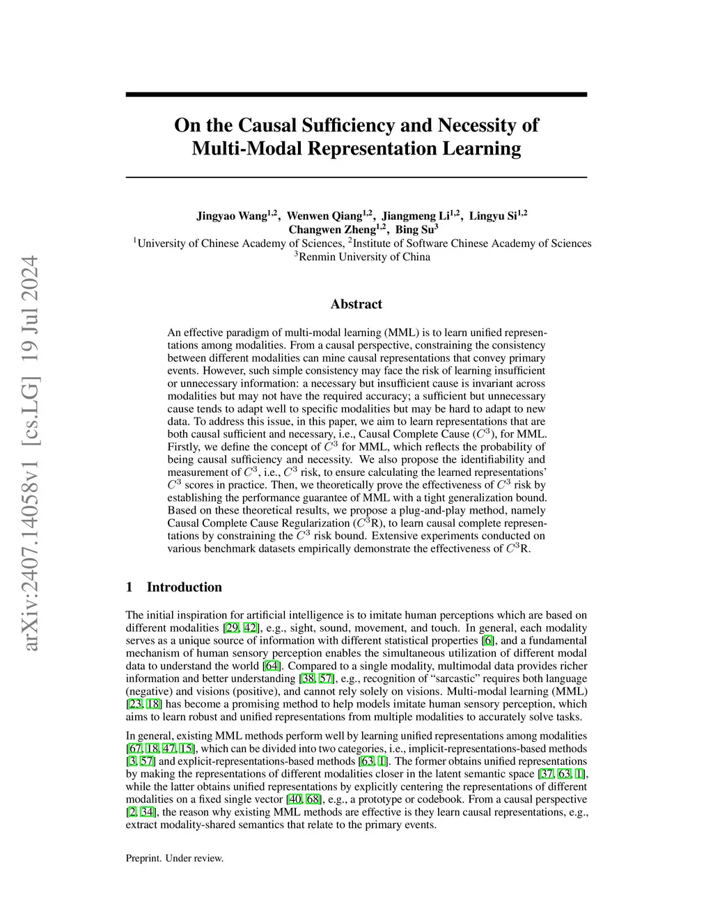 Multi-Modal Learning (MML) aims to learn effective representations across modalities for accurate predictions. Existing methods typically focus on modality consistency and specificity to learn effective representations. However, from a causal perspective, they may lead to representations that contain insufficient and unnecessary information. To address this, we propose that effective MML representations should be causally sufficient and necessary. Considering practical issues like spurious correlations and modality conflicts, we relax the exogeneity and monotonicity assumptions prevalent in prior works and explore the concepts specific to MML, i.e., Causal Complete Cause . We begin by defining , which quantifies the probability of representations being causally sufficient and necessary. We then discuss the identifiability of and introduce an instrumental variable to support identifying with non-exogeneity and non-monotonicity. Building on this, we conduct the measurement, i.e., \(C^3\) risk. We propose a twin network to estimate it through (i) the real-world branch: utilizing the instrumental variable for sufficiency, and (ii) the hypothetical-world branch: applying gradient-based counterfactual modeling for necessity. Theoretical analyses confirm its reliability. Based on these results, we propose Regularization, a plug-and-play method that enforces the causal completeness of the learned representations by minimizing risk. Extensive experiments demonstrate its effectiveness.