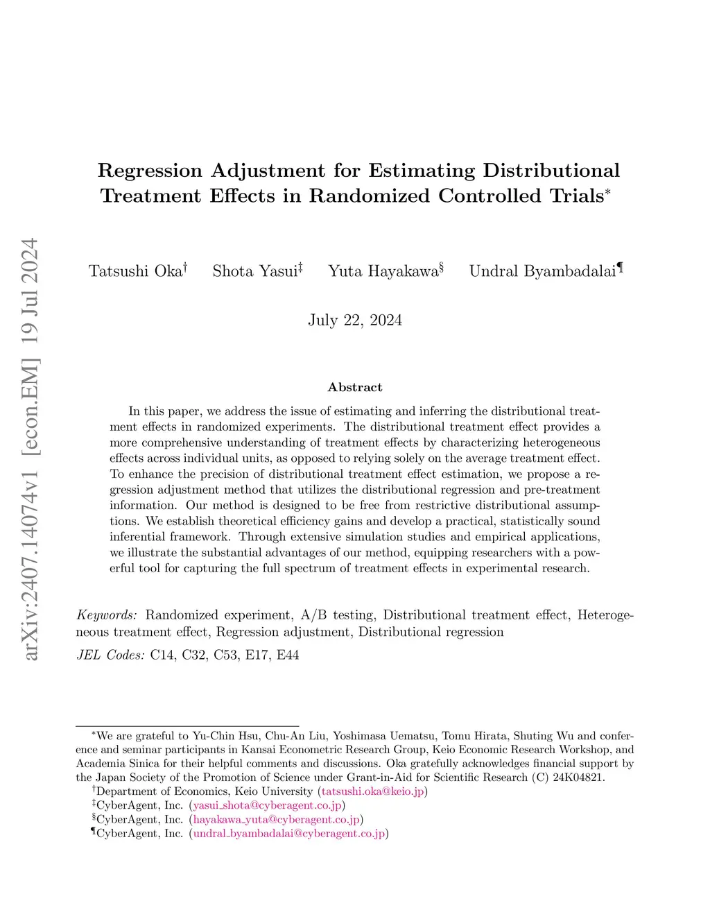 In this paper, we address the issue of estimating and inferring the distributional treatment effects in randomized experiments. The distributional treatment effect provides a more comprehensive understanding of treatment effects by characterizing heterogeneous effects across individual units, as opposed to relying solely on the average treatment effect. To enhance the precision of distributional treatment effect estimation, we propose a regression adjustment method that utilizes the distributional regression and pre-treatment information. Our method is designed to be free from restrictive distributional assumptions. We establish theoretical efficiency gains and develop a practical, statistically sound inferential framework. Through extensive simulation studies and empirical applications, we illustrate the substantial advantages of our method, equipping researchers with a powerful tool for capturing the full spectrum of treatment effects in experimental research.