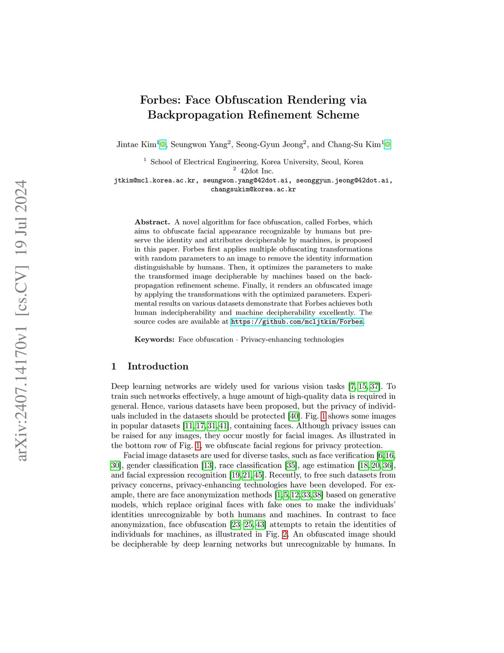 A novel algorithm for face obfuscation, called Forbes, which aims to obfuscate facial appearance recognizable by humans but preserve the identity and attributes decipherable by machines, is proposed in this paper. Forbes first applies multiple obfuscating transformations with random parameters to an image to remove the identity information distinguishable by humans. Then, it optimizes the parameters to make the transformed image decipherable by machines based on the backpropagation refinement scheme. Finally, it renders an obfuscated image by applying the transformations with the optimized parameters. Experimental results on various datasets demonstrate that Forbes achieves both human indecipherability and machine decipherability excellently. The source codes are available at https://github.com/mcljtkim/Forbes.