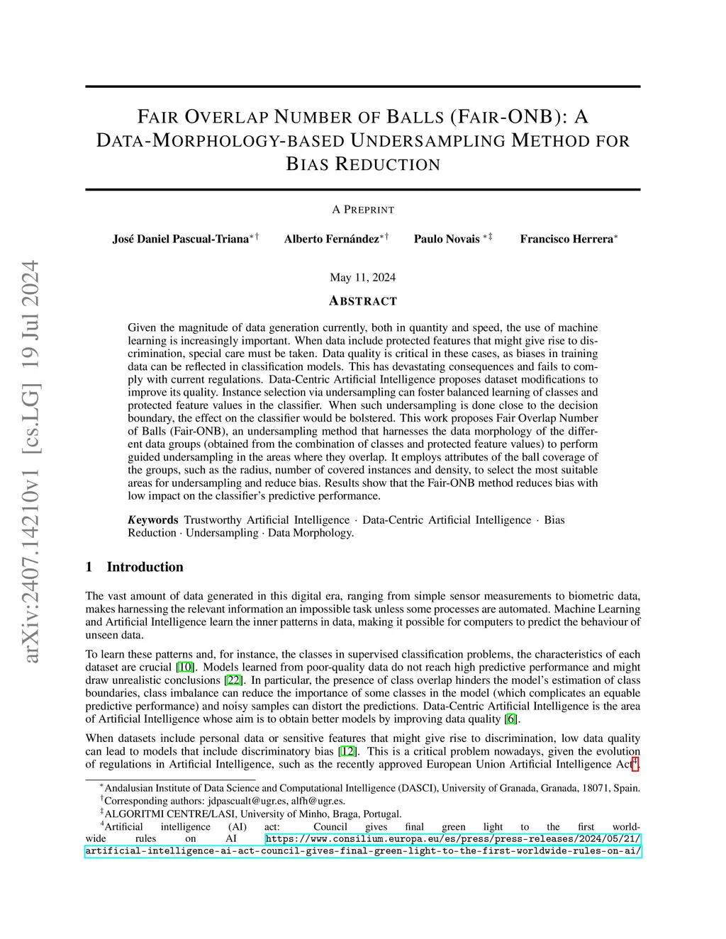 Given the magnitude of data generation currently, both in quantity and speed, the use of machine learning is increasingly important. When data include protected features that might give rise to discrimination, special care must be taken. Data quality is critical in these cases, as biases in training data can be reflected in classification models. This has devastating consequences and fails to comply with current regulations. Data-Centric Artificial Intelligence proposes dataset modifications to improve its quality. Instance selection via undersampling can foster balanced learning of classes and protected feature values in the classifier. When such undersampling is done close to the decision boundary, the effect on the classifier would be bolstered. This work proposes Fair Overlap Number of Balls (Fair-ONB), an undersampling method that harnesses the data morphology of the different data groups (obtained from the combination of classes and protected feature values) to perform guided undersampling in the areas where they overlap. It employs attributes of the ball coverage of the groups, such as the radius, number of covered instances and density, to select the most suitable areas for undersampling and reduce bias. Results show that the Fair-ONB method reduces bias with low impact on the classifier's predictive performance.