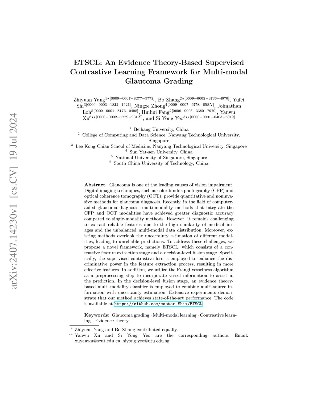 Glaucoma is one of the leading causes of vision impairment. Digital imaging techniques, such as color fundus photography (CFP) and optical coherence tomography (OCT), provide quantitative and noninvasive methods for glaucoma diagnosis. Recently, in the field of computer-aided glaucoma diagnosis, multi-modality methods that integrate the CFP and OCT modalities have achieved greater diagnostic accuracy compared to single-modality methods. However, it remains challenging to extract reliable features due to the high similarity of medical images and the unbalanced multi-modal data distribution. Moreover, existing methods overlook the uncertainty estimation of different modalities, leading to unreliable predictions. To address these challenges, we propose a novel framework, namely ETSCL, which consists of a contrastive feature extraction stage and a decision-level fusion stage. Specifically, the supervised contrastive loss is employed to enhance the discriminative power in the feature extraction process, resulting in more effective features. In addition, we utilize the Frangi vesselness algorithm as a preprocessing step to incorporate vessel information to assist in the prediction. In the decision-level fusion stage, an evidence theory-based multi-modality classifier is employed to combine multi-source information with uncertainty estimation. Extensive experiments demonstrate that our method achieves state-of-the-art performance. The code is available at \url{https://github.com/master-Shix/ETSCL}.