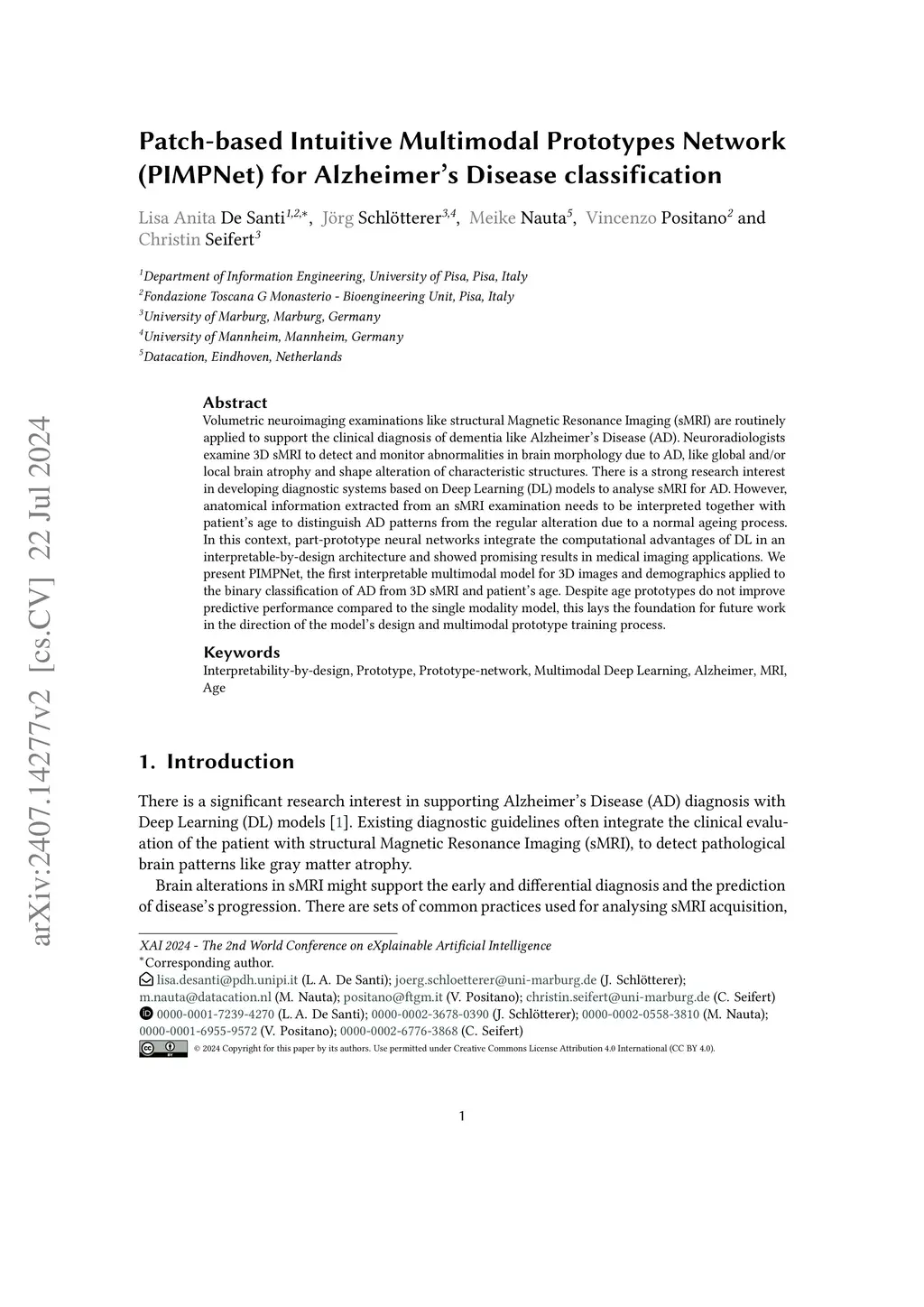 Volumetric neuroimaging examinations like structural Magnetic Resonance Imaging (sMRI) are routinely applied to support the clinical diagnosis of dementia like Alzheimer's Disease (AD). Neuroradiologists examine 3D sMRI to detect and monitor abnormalities in brain morphology due to AD, like global and/or local brain atrophy and shape alteration of characteristic structures. There is a strong research interest in developing diagnostic systems based on Deep Learning (DL) models to analyse sMRI for AD. However, anatomical information extracted from an sMRI examination needs to be interpreted together with patient's age to distinguish AD patterns from the regular alteration due to a normal ageing process. In this context, part-prototype neural networks integrate the computational advantages of DL in an interpretable-by-design architecture and showed promising results in medical imaging applications. We present PIMPNet, the first interpretable multimodal model for 3D images and demographics applied to the binary classification of AD from 3D sMRI and patient's age. Despite age prototypes do not improve predictive performance compared to the single modality model, this lays the foundation for future work in the direction of the model's design and multimodal prototype training process