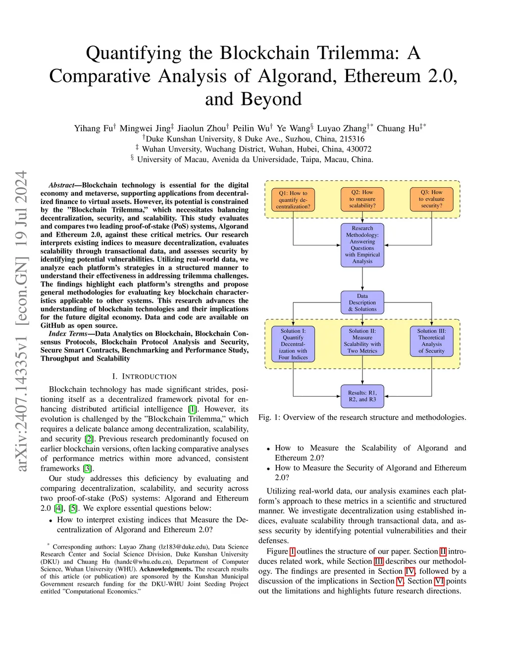 Blockchain technology is essential for the digital economy and metaverse, supporting applications from decentralized finance to virtual assets. However, its potential is constrained by the "Blockchain Trilemma," which necessitates balancing decentralization, security, and scalability. This study evaluates and compares two leading proof-of-stake (PoS) systems, Algorand and Ethereum 2.0, against these critical metrics. Our research interprets existing indices to measure decentralization, evaluates scalability through transactional data, and assesses security by identifying potential vulnerabilities. Utilizing real-world data, we analyze each platform's strategies in a structured manner to understand their effectiveness in addressing trilemma challenges. The findings highlight each platform's strengths and propose general methodologies for evaluating key blockchain characteristics applicable to other systems. This research advances the understanding of blockchain technologies and their implications for the future digital economy. Data and code are available on GitHub as open source.