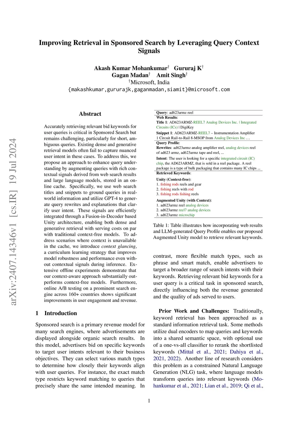 Accurately retrieving relevant bid keywords for user queries is critical in Sponsored Search but remains challenging, particularly for short, ambiguous queries. Existing dense and generative retrieval models often fail to capture nuanced user intent in these cases. To address this, we propose an approach to enhance query understanding by augmenting queries with rich contextual signals derived from web search results and large language models, stored in an online cache. Specifically, we use web search titles and snippets to ground queries in real-world information and utilize GPT-4 to generate query rewrites and explanations that clarify user intent. These signals are efficiently integrated through a Fusion-in-Decoder based Unity architecture, enabling both dense and generative retrieval with serving costs on par with traditional context-free models. To address scenarios where context is unavailable in the cache, we introduce context glancing, a curriculum learning strategy that improves model robustness and performance even without contextual signals during inference. Extensive offline experiments demonstrate that our context-aware approach substantially outperforms context-free models. Furthermore, online A/B testing on a prominent search engine across 160+ countries shows significant improvements in user engagement and revenue.