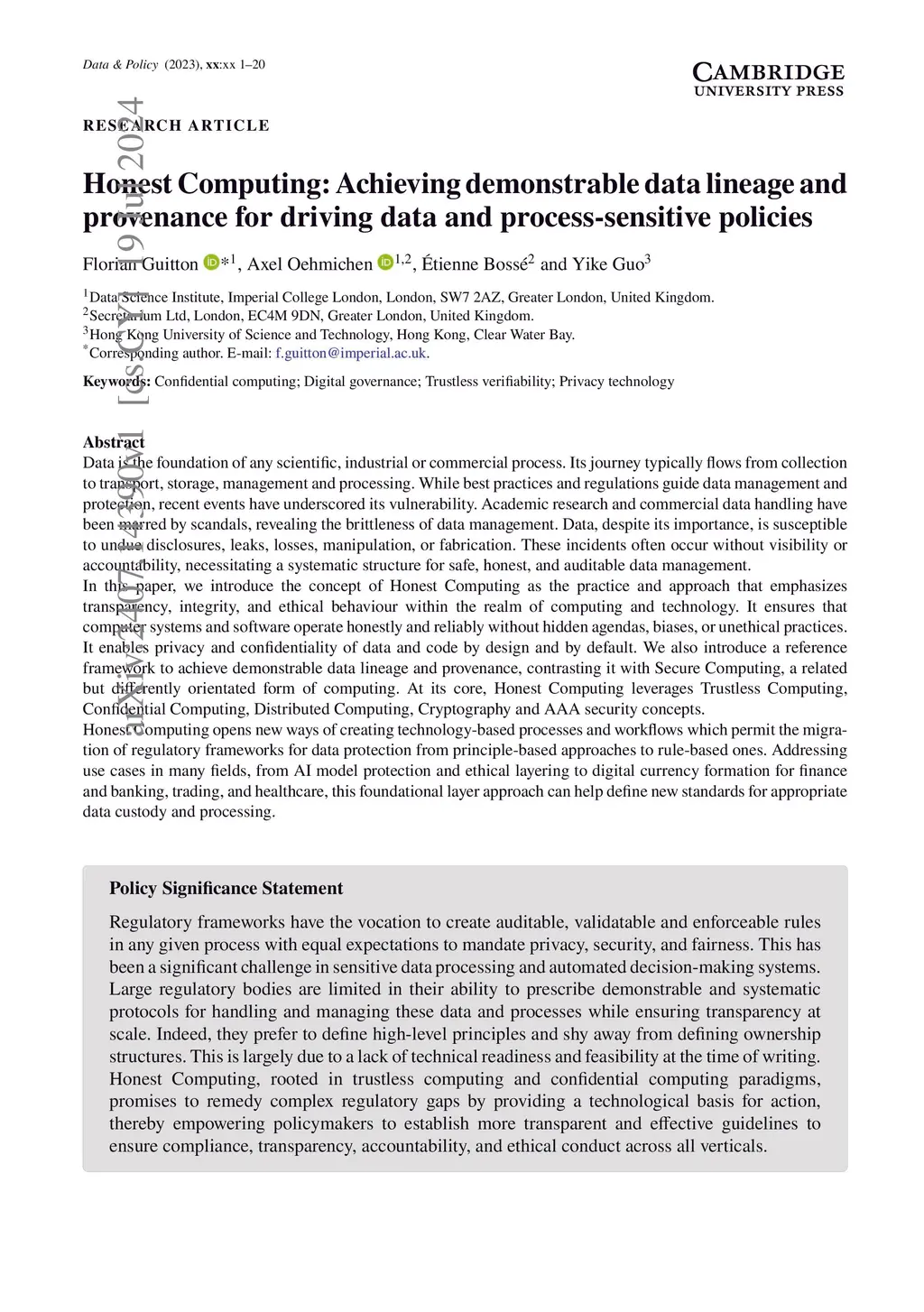 Honest Computing: Achieving demonstrable data lineage and provenance for