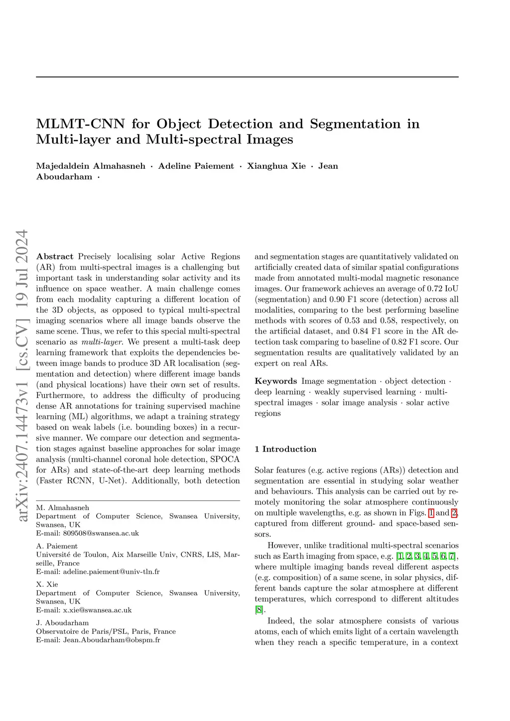 Precisely localising solar Active Regions (AR) from multi-spectral images is a challenging but important task in understanding solar activity and its influence on space weather. A main challenge comes from each modality capturing a different location of the 3D objects, as opposed to typical multi-spectral imaging scenarios where all image bands observe the same scene. Thus, we refer to this special multi-spectral scenario as multi-layer. We present a multi-task deep learning framework that exploits the dependencies between image bands to produce 3D AR localisation (segmentation and detection) where different image bands (and physical locations) have their own set of results. Furthermore, to address the difficulty of producing dense AR annotations for training supervised machine learning (ML) algorithms, we adapt a training strategy based on weak labels (i.e. bounding boxes) in a recursive manner. We compare our detection and segmentation stages against baseline approaches for solar image analysis (multi-channel coronal hole detection, SPOCA for ARs) and state-of-the-art deep learning methods (Faster RCNN, U-Net). Additionally, both detection a nd segmentation stages are quantitatively validated on artificially created data of similar spatial configurations made from annotated multi-modal magnetic resonance images. Our framework achieves an average of 0.72 IoU (segmentation) and 0.90 F1 score (detection) across all modalities, comparing to the best performing baseline methods with scores of 0.53 and 0.58, respectively, on the artificial dataset, and 0.84 F1 score in the AR detection task comparing to baseline of 0.82 F1 score. Our segmentation results are qualitatively validated by an expert on real ARs.