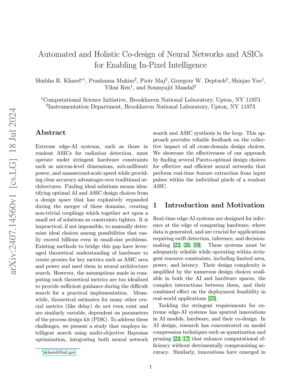 Extreme edge-AI systems, such as those in readout ASICs for radiation detection, must operate under stringent hardware constraints such as micron-level dimensions, sub-milliwatt power, and nanosecond-scale speed while providing clear accuracy advantages over traditional architectures. Finding ideal solutions means identifying optimal AI and ASIC design choices from a design space that has explosively expanded during the merger of these domains, creating non-trivial couplings which together act upon a small set of solutions as constraints tighten. It is impractical, if not impossible, to manually determine ideal choices among possibilities that easily exceed billions even in small-size problems. Existing methods to bridge this gap have leveraged theoretical understanding of hardware to f architecture search. However, the assumptions made in computing such theoretical metrics are too idealized to provide sufficient guidance during the difficult search for a practical implementation. Meanwhile, theoretical estimates for many other crucial metrics (like delay) do not even exist and are similarly variable, dependent on parameters of the process design kit (PDK). To address these challenges, we present a study that employs intelligent search using multi-objective Bayesian optimization, integrating both neural network search and ASIC synthesis in the loop. This approach provides reliable feedback on the collective impact of all cross-domain design choices. We showcase the effectiveness of our approach by finding several Pareto-optimal design choices for effective and efficient neural networks that perform real-time feature extraction from input pulses within the individual pixels of a readout ASIC.