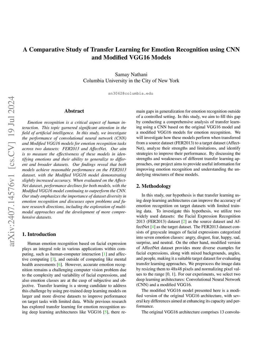 Emotion recognition is a critical aspect of human interaction. This topic garnered significant attention in the field of artificial intelligence. In this study, we investigate the performance of convolutional neural network (CNN) and Modified VGG16 models for emotion recognition tasks across two datasets: FER2013 and AffectNet. Our aim is to measure the effectiveness of these models in identifying emotions and their ability to generalize to different and broader datasets. Our findings reveal that both models achieve reasonable performance on the FER2013 dataset, with the Modified VGG16 model demonstrating slightly increased accuracy. When evaluated on the Affect-Net dataset, performance declines for both models, with the Modified VGG16 model continuing to outperform the CNN. Our study emphasizes the importance of dataset diversity in emotion recognition and discusses open problems and future research directions, including the exploration of multi-modal approaches and the development of more comprehensive datasets.
