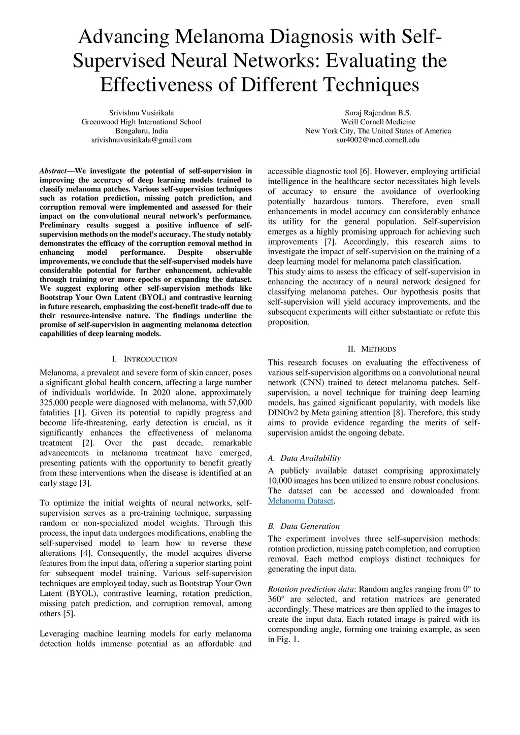 We investigate the potential of self-supervision in improving the accuracy of deep learning models trained to classify melanoma patches. Various self-supervision techniques such as rotation prediction, missing patch prediction, and corruption removal were implemented and assessed for their impact on the convolutional neural network's performance. Preliminary results suggest a positive influence of self-supervision methods on the model's accuracy. The study notably demonstrates the efficacy of the corruption removal method in enhancing model performance. Despite observable improvements, we conclude that the self-supervised models have considerable potential for further enhancement, achievable through training over more epochs or expanding the dataset. We suggest exploring other self-supervision methods like Bootstrap Your Own Latent (BYOL) and contrastive learning in future research, emphasizing the cost-benefit trade-off due to their resource-intensive nature. The findings underline the promise of self-supervision in augmenting melanoma detection capabilities of deep learning models.