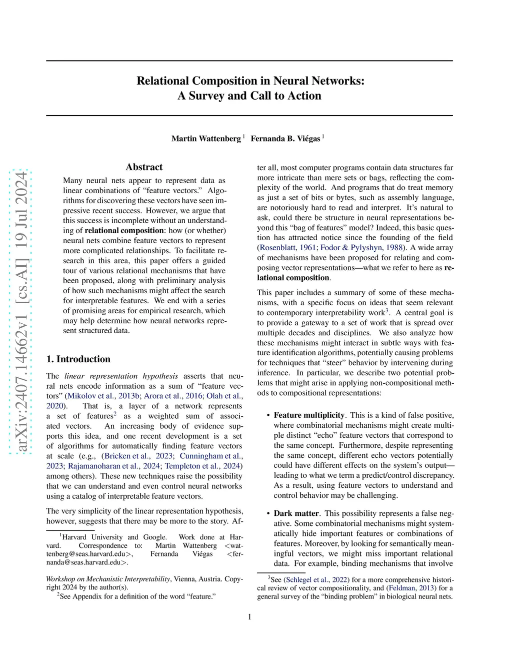 Many neural nets appear to represent data as linear combinations of "feature vectors." Algorithms for discovering these vectors have seen impressive recent success. However, we argue that this success is incomplete without an understanding of relational composition: how (or whether) neural nets combine feature vectors to represent more complicated relationships. To facilitate research in this area, this paper offers a guided tour of various relational mechanisms that have been proposed, along with preliminary analysis of how such mechanisms might affect the search for interpretable features. We end with a series of promising areas for empirical research, which may help determine how neural networks represent structured data.
