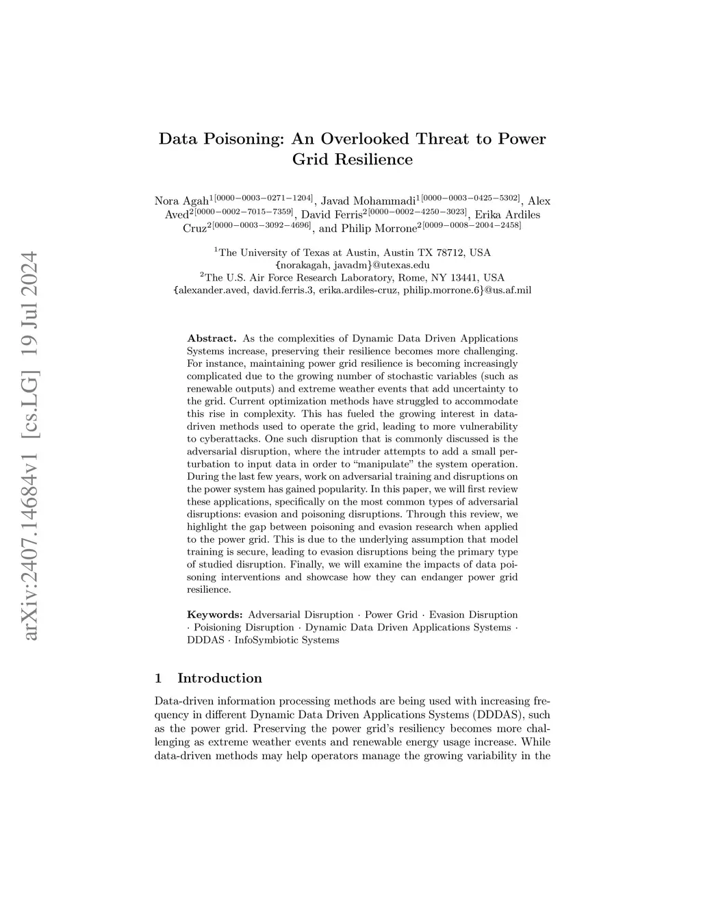As the complexities of Dynamic Data Driven Applications Systems increase, preserving their resilience becomes more challenging. For instance, maintaining power grid resilience is becoming increasingly complicated due to the growing number of stochastic variables (such as renewable outputs) and extreme weather events that add uncertainty to the grid. Current optimization methods have struggled to accommodate this rise in complexity. This has fueled the growing interest in data-driven methods used to operate the grid, leading to more vulnerability to cyberattacks. One such disruption that is commonly discussed is the adversarial disruption, where the intruder attempts to add a small perturbation to input data in order to "manipulate" the system operation. During the last few years, work on adversarial training and disruptions on the power system has gained popularity. In this paper, we will first review these applications, specifically on the most common types of adversarial disruptions: evasion and poisoning disruptions. Through this review, we highlight the gap between poisoning and evasion research when applied to the power grid. This is due to the underlying assumption that model training is secure, leading to evasion disruptions being the primary type of studied disruption. Finally, we will examine the impacts of data poisoning interventions and showcase how they can endanger power grid resilience.