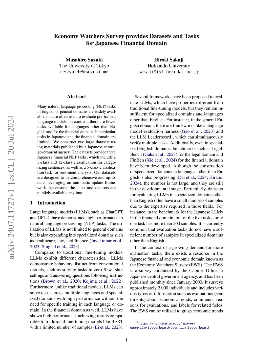 Economy Watchers Survey Provides Datasets and Tasks for Japanese Financial Domain