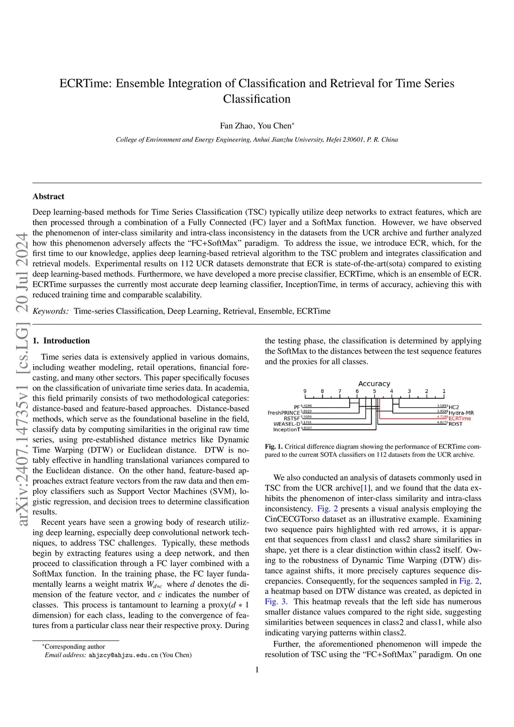 Deep learning-based methods for Time Series Classification (TSC) typically utilize deep networks to extract features, which are then processed through a combination of a Fully Connected (FC) layer and a SoftMax function. However, we have observed the phenomenon of inter-class similarity and intra-class inconsistency in the datasets from the UCR archive and further analyzed how this phenomenon adversely affects the "FC+SoftMax" paradigm. To address the issue, we introduce ECR, which, for the first time to our knowledge, applies deep learning-based retrieval algorithm to the TSC problem and integrates classification and retrieval models. Experimental results on 112 UCR datasets demonstrate that ECR is state-of-the-art(sota) compared to existing deep learning-based methods. Furthermore, we have developed a more precise classifier, ECRTime, which is an ensemble of ECR. ECRTime surpasses the currently most accurate deep learning classifier, InceptionTime, in terms of accuracy, achieving this with reduced training time and comparable scalability.