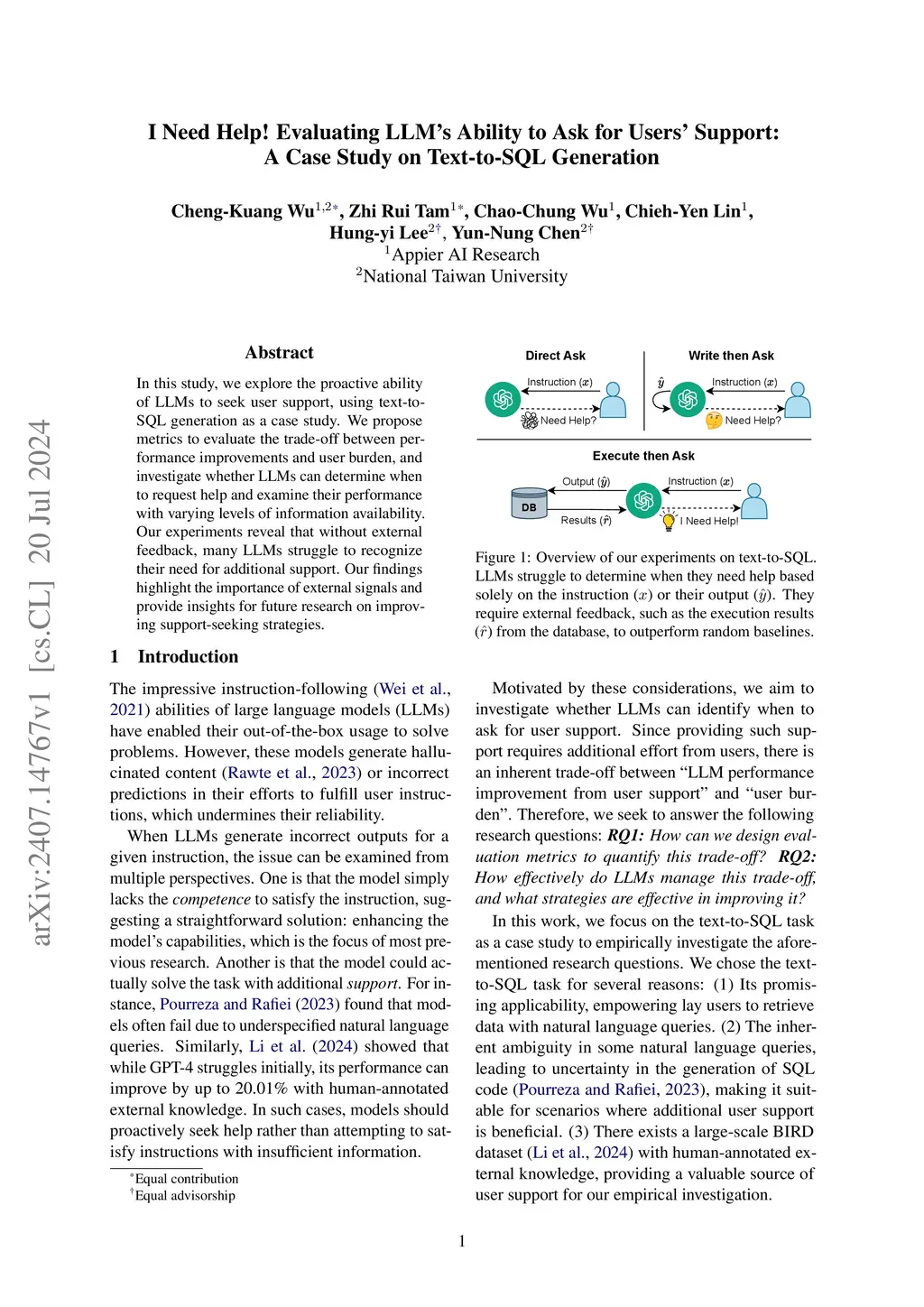 In this study, we explore the proactive ability of LLMs to seek user support, using text-to-SQL generation as a case study. We propose metrics to evaluate the trade-off between performance improvements and user burden, and investigate whether LLMs can determine when to request help and examine their performance with varying levels of information availability. Our experiments reveal that without external feedback, many LLMs struggle to recognize their need for additional support. Our findings highlight the importance of external signals and provide insights for future research on improving support-seeking strategies.