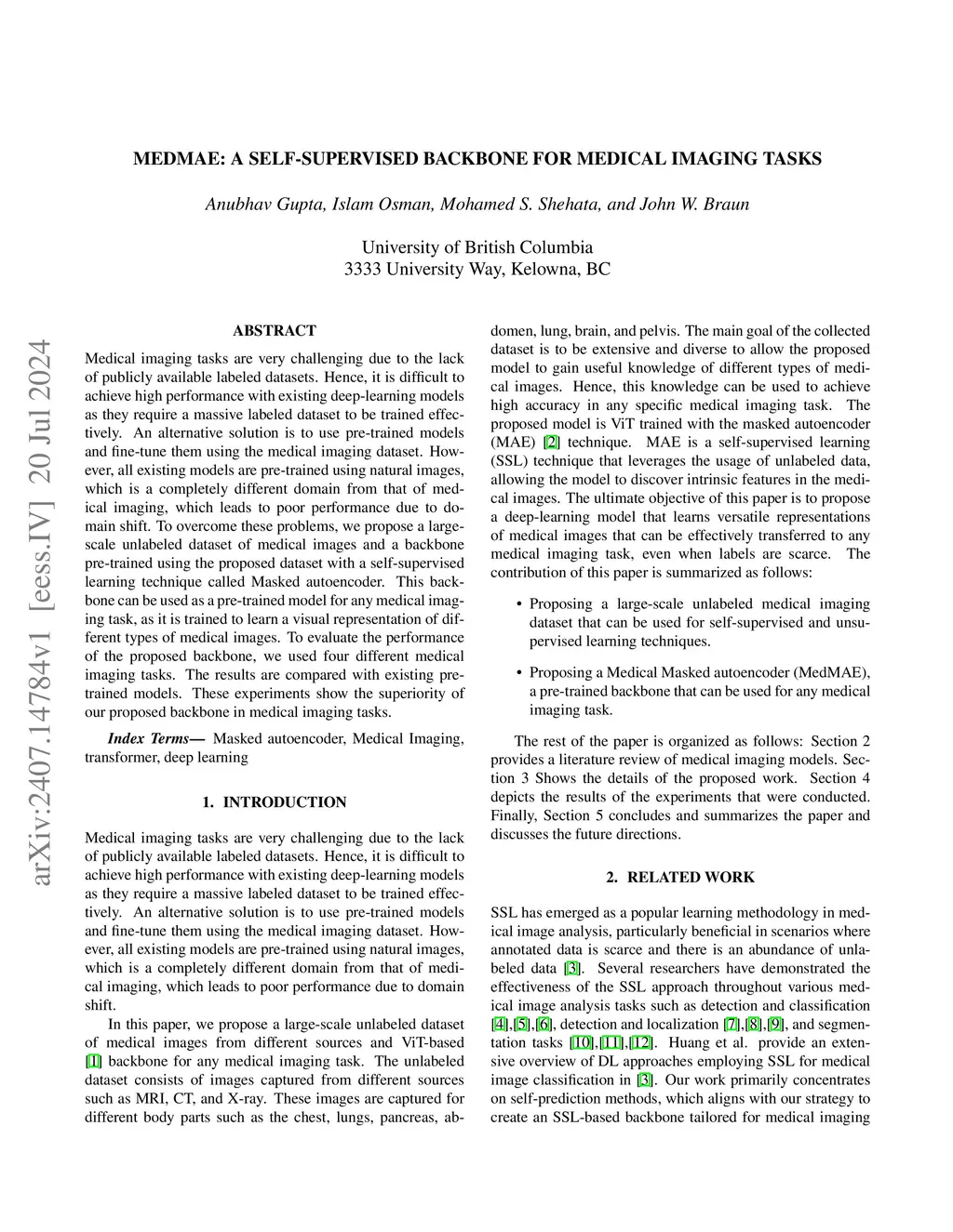 Medical imaging tasks are very challenging due to the lack of publicly available labeled datasets. Hence, it is difficult to achieve high performance with existing deep-learning models as they require a massive labeled dataset to be trained effectively. An alternative solution is to use pre-trained models and fine-tune them using the medical imaging dataset. However, all existing models are pre-trained using natural images, which is a completely different domain from that of medical imaging, which leads to poor performance due to domain shift. To overcome these problems, we propose a large-scale unlabeled dataset of medical images and a backbone pre-trained using the proposed dataset with a self-supervised learning technique called Masked autoencoder. This backbone can be used as a pre-trained model for any medical imaging task, as it is trained to learn a visual representation of different types of medical images. To evaluate the performance of the proposed backbone, we used four different medical imaging tasks. The results are compared with existing pre-trained models. These experiments show the superiority of our proposed backbone in medical imaging tasks.
