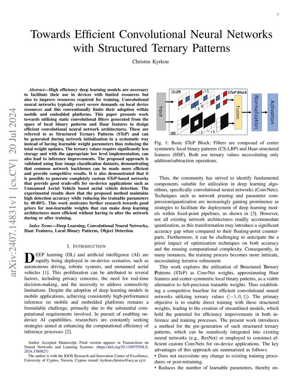 High-efficiency deep learning (DL) models are necessary not only to facilitate their use in devices with limited resources but also to improve resources required for training. Convolutional neural networks (ConvNets) typically exert severe demands on local device resources and this conventionally limits their adoption within mobile and embedded platforms. This brief presents work toward utilizing static convolutional filters generated from the space of local binary patterns (LBPs) and Haar features to design efficient ConvNet architectures. These are referred to as Structured Ternary Patterns (STePs) and can be generated during network initialization in a systematic way instead of having learnable weight parameters thus reducing the total weight updates. The ternary values require significantly less storage and with the appropriate low-level implementation, can also lead to inference improvements. The proposed approach is validated using four image classification datasets, demonstrating that common network backbones can be made more efficient and provide competitive results. It is also demonstrated that it is possible to generate completely custom STeP-based networks that provide good trade-offs for on-device applications such as unmanned aerial vehicle (UAV)-based aerial vehicle detection. The experimental results show that the proposed method maintains high detection accuracy while reducing the trainable parameters by 40-80%. This work motivates further research toward good priors for non-learnable weights that can make DL architectures more efficient without having to alter the network during or after training.