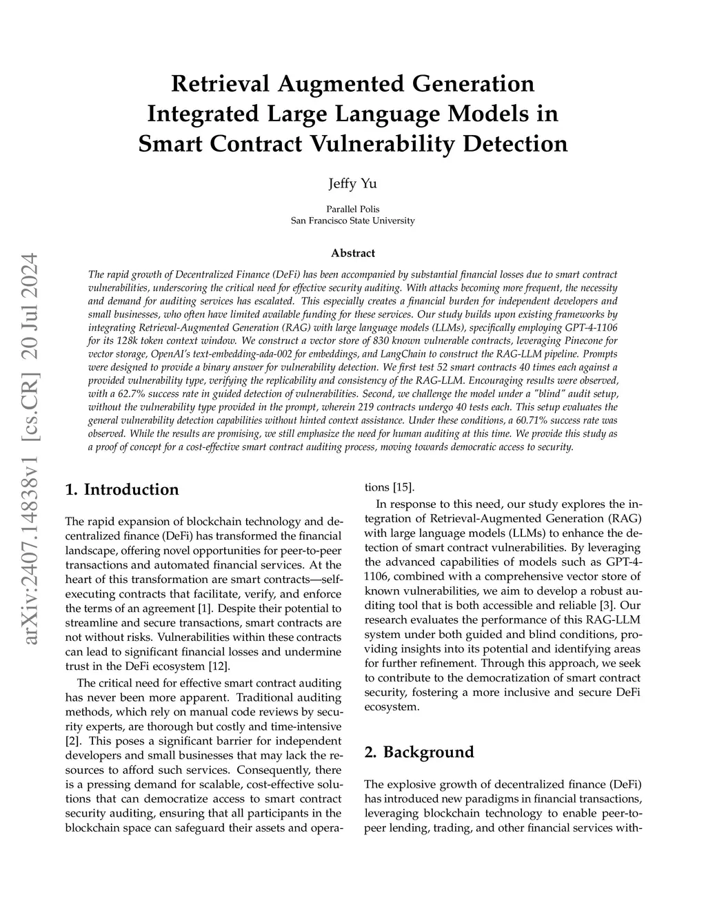 The rapid growth of Decentralized Finance (DeFi) has been accompanied by substantial financial losses due to smart contract vulnerabilities, underscoring the critical need for effective security auditing. With attacks becoming more frequent, the necessity and demand for auditing services has escalated. This especially creates a financial burden for independent developers and small businesses, who often have limited available funding for these services. Our study builds upon existing frameworks by integrating Retrieval-Augmented Generation (RAG) with large language models (LLMs), specifically employing GPT-4-1106 for its 128k token context window. We construct a vector store of 830 known vulnerable contracts, leveraging Pinecone for vector storage, OpenAI's text-embedding-ada-002 for embeddings, and LangChain to construct the RAG-LLM pipeline. Prompts were designed to provide a binary answer for vulnerability detection. We first test 52 smart contracts 40 times each against a provided vulnerability type, verifying the replicability and consistency of the RAG-LLM. Encouraging results were observed, with a 62.7% success rate in guided detection of vulnerabilities. Second, we challenge the model under a "blind" audit setup, without the vulnerability type provided in the prompt, wherein 219 contracts undergo 40 tests each. This setup evaluates the general vulnerability detection capabilities without hinted context assistance. Under these conditions, a 60.71% success rate was observed. While the results are promising, we still emphasize the need for human auditing at this time. We provide this study as a proof of concept for a cost-effective smart contract auditing process, moving towards democratic access to security.