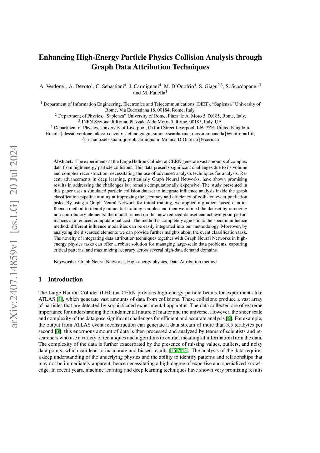 The experiments at the Large Hadron Collider at CERN generate vast amounts of complex data from high-energy particle collisions. This data presents significant challenges due to its volume and complex reconstruction, necessitating the use of advanced analysis techniques for analysis. Recent advancements in deep learning, particularly Graph Neural Networks, have shown promising results in addressing the challenges but remain computationally expensive. The study presented in this paper uses a simulated particle collision dataset to integrate influence analysis inside the graph classification pipeline aiming at improving the accuracy and efficiency of collision event prediction tasks. By using a Graph Neural Network for initial training, we applied a gradient-based data influence method to identify influential training samples and then we refined the dataset by removing non-contributory elements: the model trained on this new reduced dataset can achieve good performances at a reduced computational cost. The method is completely agnostic to the specific influence method: different influence modalities can be easily integrated into our methodology. Moreover, by analyzing the discarded elements we can provide further insights about the event classification task. The novelty of integrating data attribution techniques together with Graph Neural Networks in high-energy physics tasks can offer a robust solution for managing large-scale data problems, capturing critical patterns, and maximizing accuracy across several high-data demand domains.